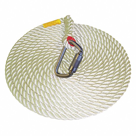 100 ft (30.5 m) Nylon 5/8 in (16 mm) diameter rope lifeline with carabiner at one end, taped at other. Nylon rope provides resistance to UV, wear and shock, making it a great choice for long-term use even in harsh environments. Vertical lifelines and vertical lifeline subsystems are intended to be used as part of a personal fall arrest or restraint system. These lifelines and lifeline subsystems are not designed for use in horizontal lifeline systems.