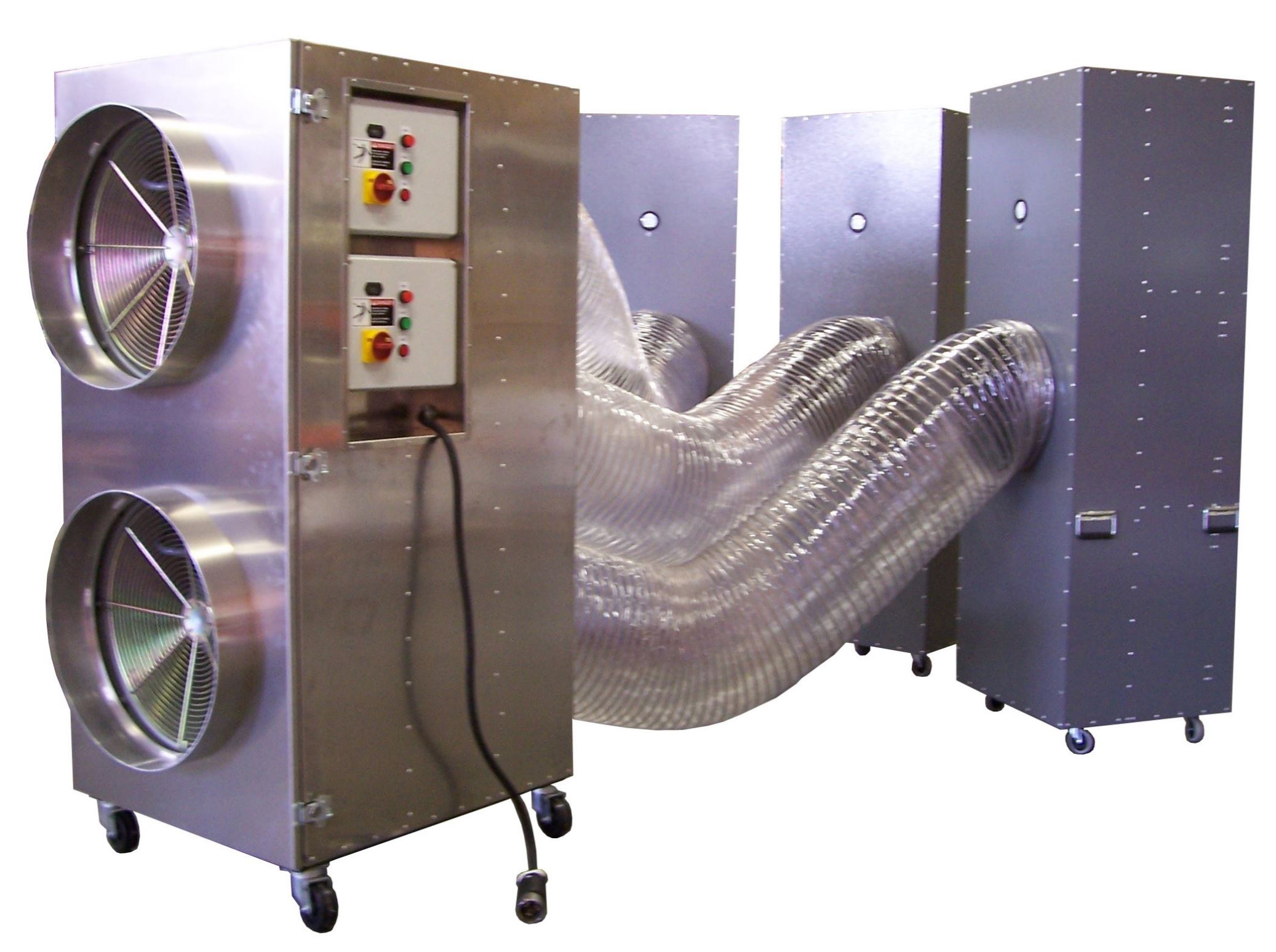 The OmniAire 18000 is our largest portable HEPA air system with 18,000 CFM air flow capacity. The 18000 is a modular air filtration machine with unique versatility for large scale cleanup. This machine is used to purify and re-circulate air or create positive or negative air pressure containment areas. The 18000 is also ideal for large mold, asbestos & lead abatement projects, construction sites, restoration projects, water damage/fire damage clean-up and more. The high powered OmniAire 18000 air filtration system ships standard with a single blower unit, three HEPA cabinets and nine 99.97% efficient HEPA filters. The OmniAire 18000 modular system consists of a blower cabinet and three filter cabinets, all connected by flex hoses. The cabinets are easy to transport and setup is a breeze at various types of projects, including HAZMAT removal jobs.