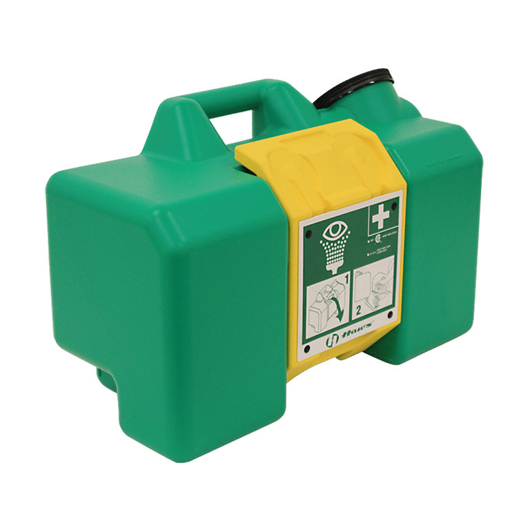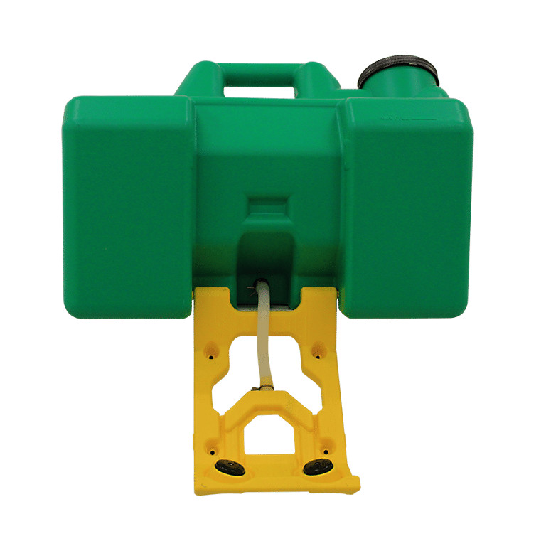 The Haws model 7501 compact portable gravity operated eyewash shall include a FDA approved high-density green polyethylene 9 gallon (34.1 L) tank, ABS plastic eyewash heads with a continuous 0.4 gpm (1.5 L) flow rate over 15 minutes, yellow pull-down activation arm, integral handle with 'lift here' graphics on top, clearly visible fill line, wide-fill threaded cap, sign-mounted operating instructions, and stainless steel wall bracket (unit must be hung). Additive not included - Order separately.