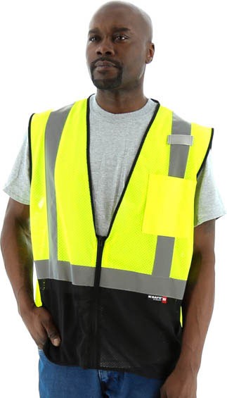 The 75-3213 by Majestic is an ANSI Class 2 hi vis yellow, black bottom mesh safety vest. Made with polyester mesh, this style design features a left chest mic tab, left chest pocket and an inside waist pocket. Zipper front closure is met in the front. This hi vis workwear meets ANSI/ISEA 107-2015 Type R, Class 2 standards with 2 in silver reflective striping.