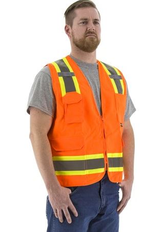 Surveyors vest in high visibility with high contrasting DOT reflective for increased daytime visibility. Solid polyester front and back. This surveyors vest has 7 full sized pocket to carry everything a surveyor requires for the job. Features radio pocket with Velcro closure, large chest pocket, two large waist pockets with Velcro closures and two large inside pockets. Four individual pen pockets. Heavy duty zipper front closure and heavy duty microphone tabs. This hi-vis workwear meets ANSI/ISEA 107-2015 Type R, Class 2 standards.