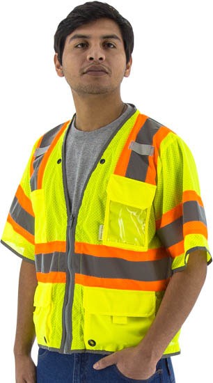 Two-tone striped mesh vest features a unique D-ring pass thru and high-visibility piping around the edges to give you an enhanced safety factor. Vest also offers a clear ID badge holder, four pen pockets, two waist pockets with velcro closures, and two radio mic tabs on the left and right chest. Meets ANSI/ISEA 107-2010 Class 3 standard.
