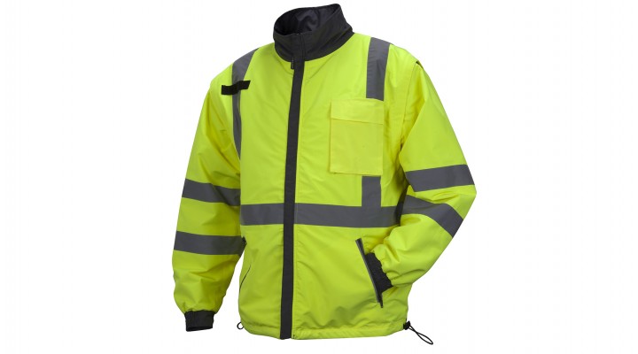 The RHR341 by Pyramex is a hi vis, 4 in 1 jacket. This weatherproof jacket can reverse from hi vis lime to gray and black. Removable, zip-out sleeves convert the class 3 jacket into a class 2 vest. ANSI standards are met with 2 in gray reflective tape that aligns the jacket on the hi visibility side. Hi vis reflective piping on the gray and black side provide further accents. The bottom hem can be adjusted with a bungee cord with toggle pull. 6 Pockets are located on the hi-vis side while 3 additional pockets are featured within the black and gray side. A single mic tab is featured on the right hi vis shoulder as well.
