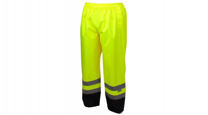 The RRWP3110 by Pyramex are ANSI Class E hi vis lime, black bottom trim rain pants. These pants are constructed with 150D 100% Oxford Polyester with a PU coating, along with a contrasted black 210D 100% Oxford Nylon that is also PU coated. These waterproof pants feature sewn and sealed seams and are secured with an elastic waist band and metal take up snaps at the bottom of the pant legs. 2 Reach through pockets are located on the sides. This hi vis workwear meets ANSI/ISEA 2015-107 Class E Standards with 2 in silver reflective material.