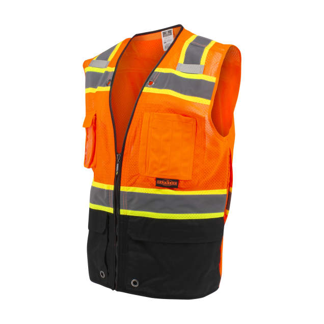 The Radians SV51B is a two-toned color-blocked hi-vis vest with zippered phone and tablet pockets, so your expensive devices stay secure within your vest. This helps them stay secure in your pockets alleviating the possibility of damage to your phone or tablet or to others working below you. The black binding and color-blocked front help maintain a clean and professional look. Plus, the longer shirt tail hem delivers better coverage in the back. This surveyor-styled vest is feature-rich and has numerous applications in construction, manufacturing, and maintenance. Rated ANSI/ISEA 107 Type R Class 2.