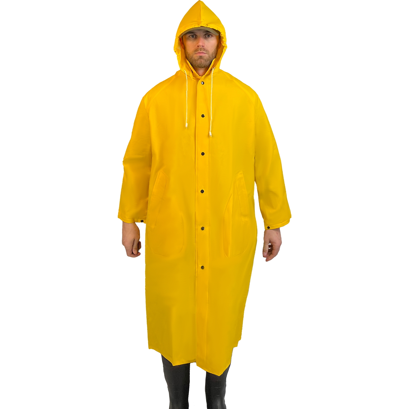 Industrial economy PVC outerwear 48 in coat is made of a 0.35 mm PVC coated Polyester scrim material. Features include snaps on the collar and a snap-on hood with draw string, snap front closure with storm flap, raglan sleeves with vented back, take up snaps on the sleeves and side pockets. The 100% waterproof garment seams are electronically welded. The garment fills the need for a basic "limited use" low cost raincoat suited for general industrial, event staff, parking attendants and basic construction wear.