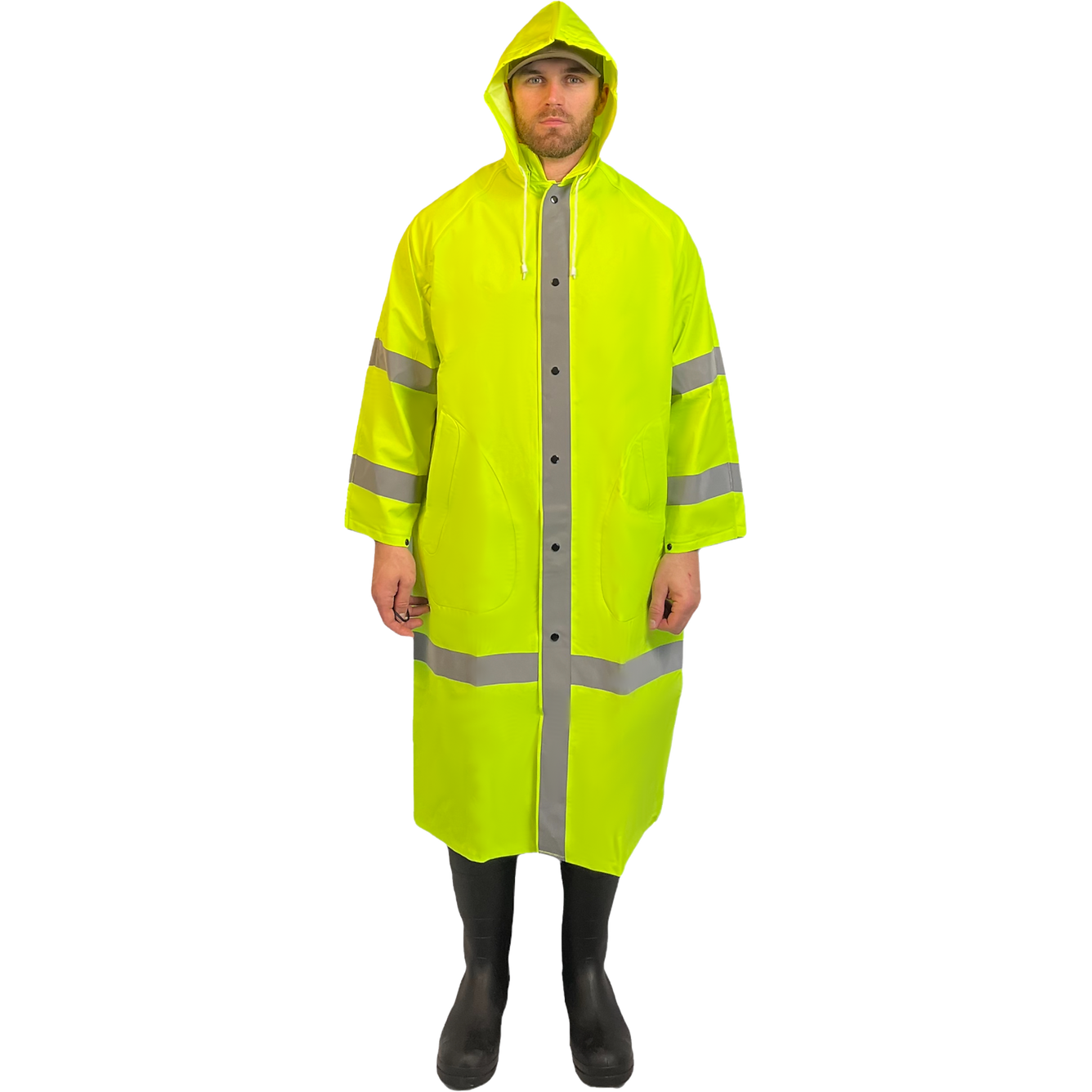 Industrial economy PVC outerwear 48 in coat is made of a 0.35 mm PVC coated Polyester scrim material with 2 in silver reflective film. Features include snaps on the collar and a snap-on hood with draw string, snap front closure with storm flap, raglan sleeves with vented back, take-up snaps on the sleeves and side pockets. The 100% waterproof garment seams are electronically welded. The Fluorescent Yellow color and reflective film of the garment provide enhanced visibility to the wearer but meets no high visibility standard. The garment fills the need for a basic "limited use" low cost raincoat and is suited for general industrial, event staff, parking attendants and basic construction wear.