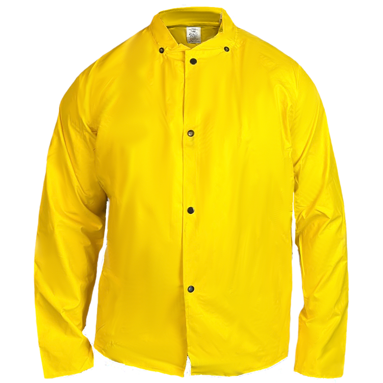 Industrial protective PVC outerwear jacket is made of a double PVC coated 210 denier nylon scrim material. Features include snaps on the collar for optional hood (200HOD), snap front closure, storm flap and raglan sleeves. The 100% waterproof garment seams are double needle stitched and taped on the inside. The jacket meets ASTM D6413 (Limited Flame Resistance); <6 inch charlength, <2 second afterlame, no melting and dripping. The jacket offers the wearer excellent lightweight abrasion and tear resistance and is ideal for industrial or facility maintenance, public sewer/water works and construction crews.