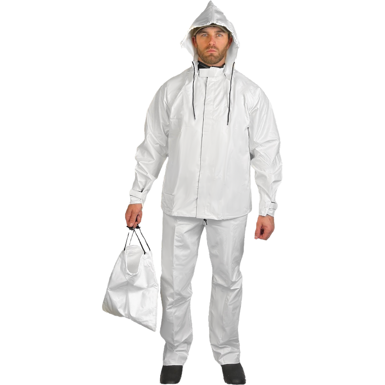 - The hood has snaps for attachment to the jacket and the bag has a draw string for closure