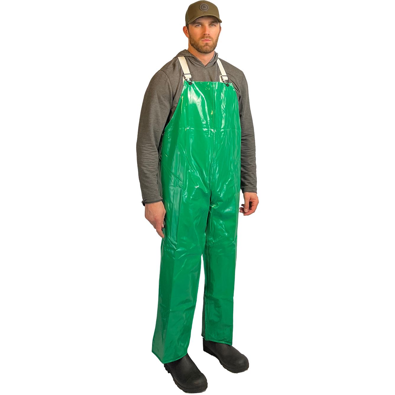 Industrial protective PVC outerwear bib trousers is made of a Polyester reinforcing fabric coated on the outside with PVC and on the inside with Polyurethane. Features include adjustable elastic suspenders with back divider, protective bib front and non-conductive buckles. The 100% waterproof garment seams are electronically double welded. The trousers meet ASTM D6413 (Limited Flame Resistance), <6 inch charlength, <2 second afterlame, no melting and dripping) and ASTM F903 for certain chemicals. The trousers offer the wearer excellent abrasion and tear resistance. They are ideal for chemical transport/handling (Incidental Splash), chemical plant maintenance, sewer/water works, sanitation and general industrial wear.