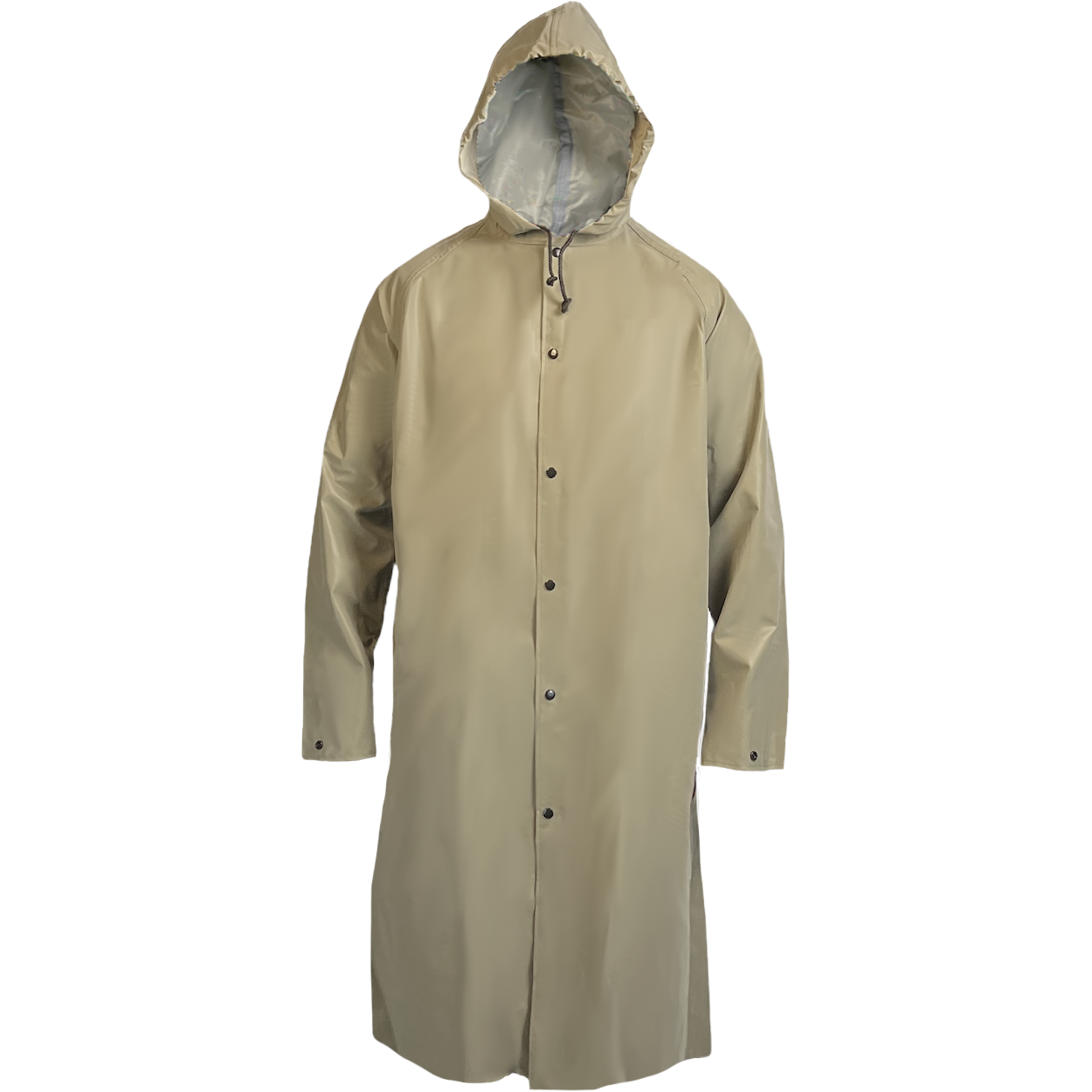 Industrial protective Neoprene outerwear coat made of a Neoprene coated 210 denier woven nylon material. Features include attached hood with drawstring, generally a 48 in length, snap front closure with storm flap and raglan sleeves. The 100% waterproof garment seams are double needle stitched and seam seal taped on the inside. The material meets ASTM D6413 (Limited Flame Resistance); <6 inch charlength, <2 second afterlame, no melting and dripping. The coat offers the wearer outstanding abrasion resistance and is ideal for industrial or facility maintenance, public sewer/water works, agriculture and construction crews.