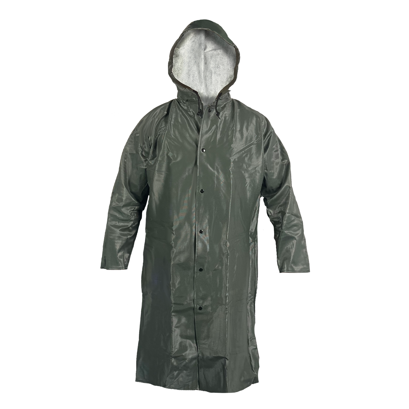 Industrial protective PVC outerwear 48 in coat is made of Non-Woven Polyester fabric coated on the outside with rib embossed PVC. Features include corduroy trimmed collar, attached hood, snap front closure, storm flap and batwing sleeve design. The 100% waterproof garment seams are electronically welded. The fabric meets FMVSS 302 flame resistance standard. The coat offers the wearer excellent abrasion resistance and is ideal for durable rainwear coverage. and basic protective wear for agriculture, construction and basic industrial work. Available in Dark Green in sizes Small through 6X.