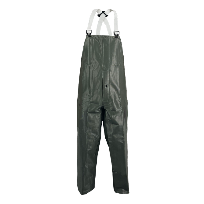 Industrial protective PVC outerwear Bib Trousers is made of Non-Woven Polyester fabric coated. on the outside with rib embossed PVC. Features include protective bib front, front safety fly with snap closure, non-conductive buckles, adjustable suspenders with back divider and a wide leg design. The 100% waterproof garment seams are electronically welded. The fabric meets FMVSS 302 flame resistance standard. The bib trousers offer the wearer excellent abrasion resistance and is ideal for durable rainwear coverage and basic protective wear for agriculture, construction and basic industrial work.