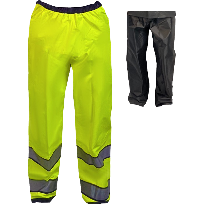 High Visibility Yellow/Black reversible Outerwear Elastic Waist Trouser made of a single ply material consisting of Black 200 denier woven Nylon coated with Fluorescent Yellow pigmented Polyurethane. The trousers feature elastic at the waist, snap closure adjustable 5 in openings at the hips and 2 in Silver reflective tape with 1/4 in Black edge trim. The garment is 100% waterproof with double needle stitched seams that are seam seal taped on the PU side. The garment is certified to ANSI 107-2015, Class E. The lightweight, waterproof, windproof, high visibility rainwear has applications for public safety officers, transportation, road crews, public works, facility maintenance.