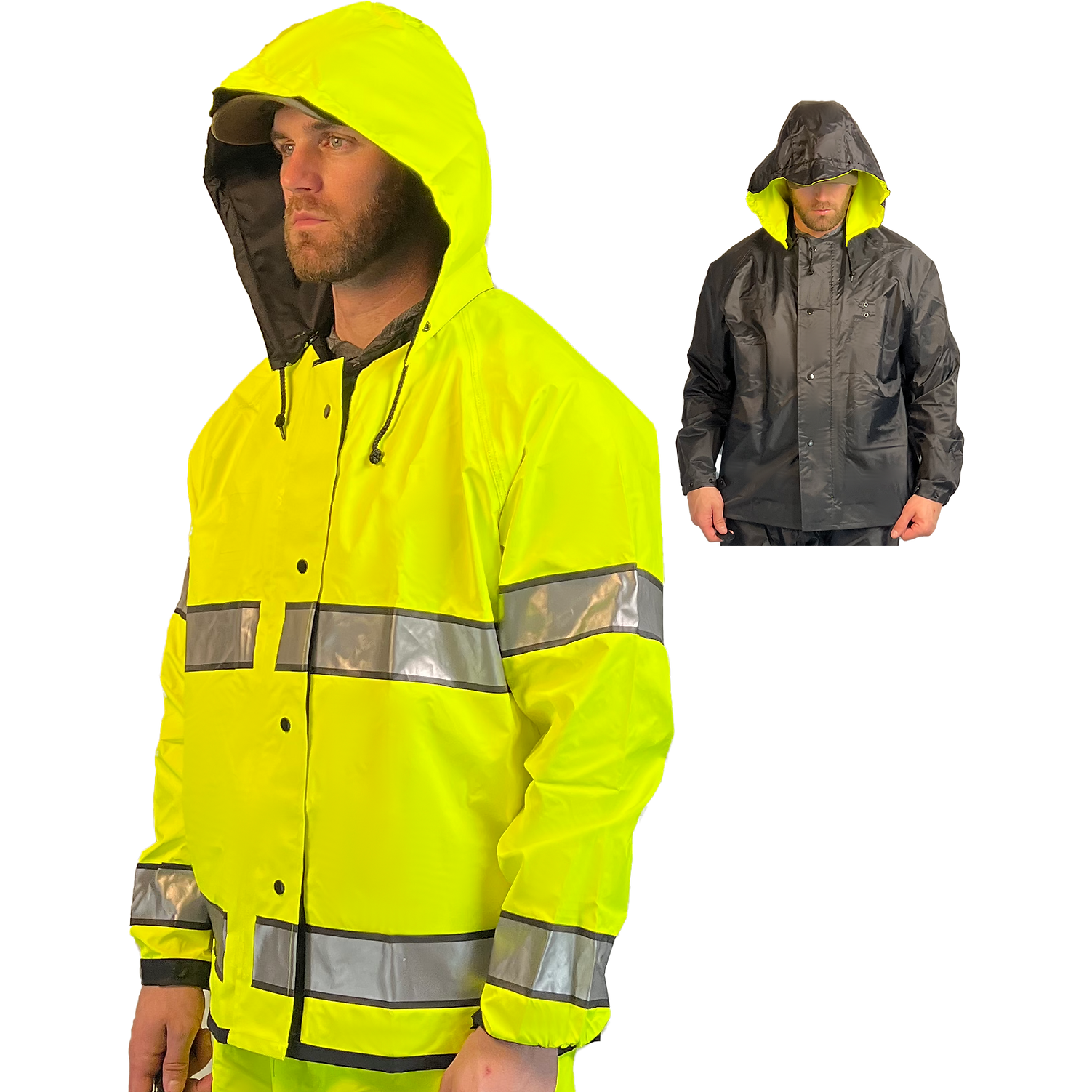 High Visibility Yellow/Black reversible Outerwear 30 in Jacket made of a single ply material consisting of Black 200 denier woven Nylon coated with Fluorescent Yellow pigmented Polyurethane. The jacket features snaps under the leaf collar for attachment of the included snap on hood, front storm flap snap closure, elastic half way around at the wrist with snap take-up tabs on the Black side, side slits with snap closure, raglan sleeve design and 2 in Silver reflective tape with 1/4 in Black edge trim. The garment is 100% waterproof with double needle stitched seams that are seam seal taped on the PU side. The garment is certified to ANSI 107- 2015, Class 3. The lightweight, waterproof, windproof, high visibility rainwear has applications for public safety officers, transportation, road crews, public works, facility maintenance.