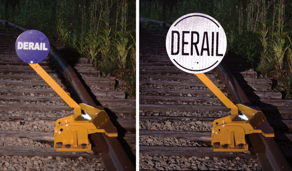Day or night, the 18 in diameter MoonSign derail plate cannot be missed! It is over three times the area of the usual blue derail sign. White retro-reflective white facing and over-sized DERAIL lettering on both sides mean MoonSign can be seen at a greater distance night or day than the usual small blue derail sign. MoonSign sign plate fits any Aldon derail sign holder, hinged or portable.