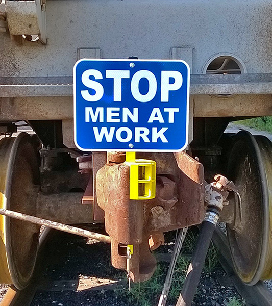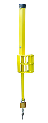 Coupler Lock shaft fits sign post hole found on all railway couplers. The steel "cage" in the middle of the shaft fits inside the knuckle of the coupler, thus stopping a worker from attempting to couple to the stationary car. Holder supports a 12" x 15" OSHA-mandated Blue Flag sign (order separately).