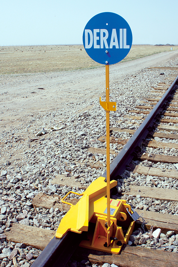 • Easy Installation: The derails’ horizontal base plate is integrated with the derail housing, which ensures a perfectly aligned derail, and eliminates adzing and shimming of the ties. This unique base design requires no tie strapping or rail braces on the field side of the rails. The derail becomes a fixed part of the track.