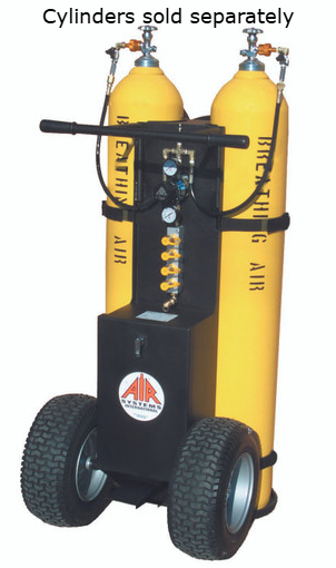 The MULTI-PAK series of large air cylinder carts are designed for long duration industrial applications and built for mobility and function. The carts incorporate protected recessed controls, equipment storage boxes, a narrow profile for maneuverability, 16" pneumatic tires, and quick-release hose hangers.