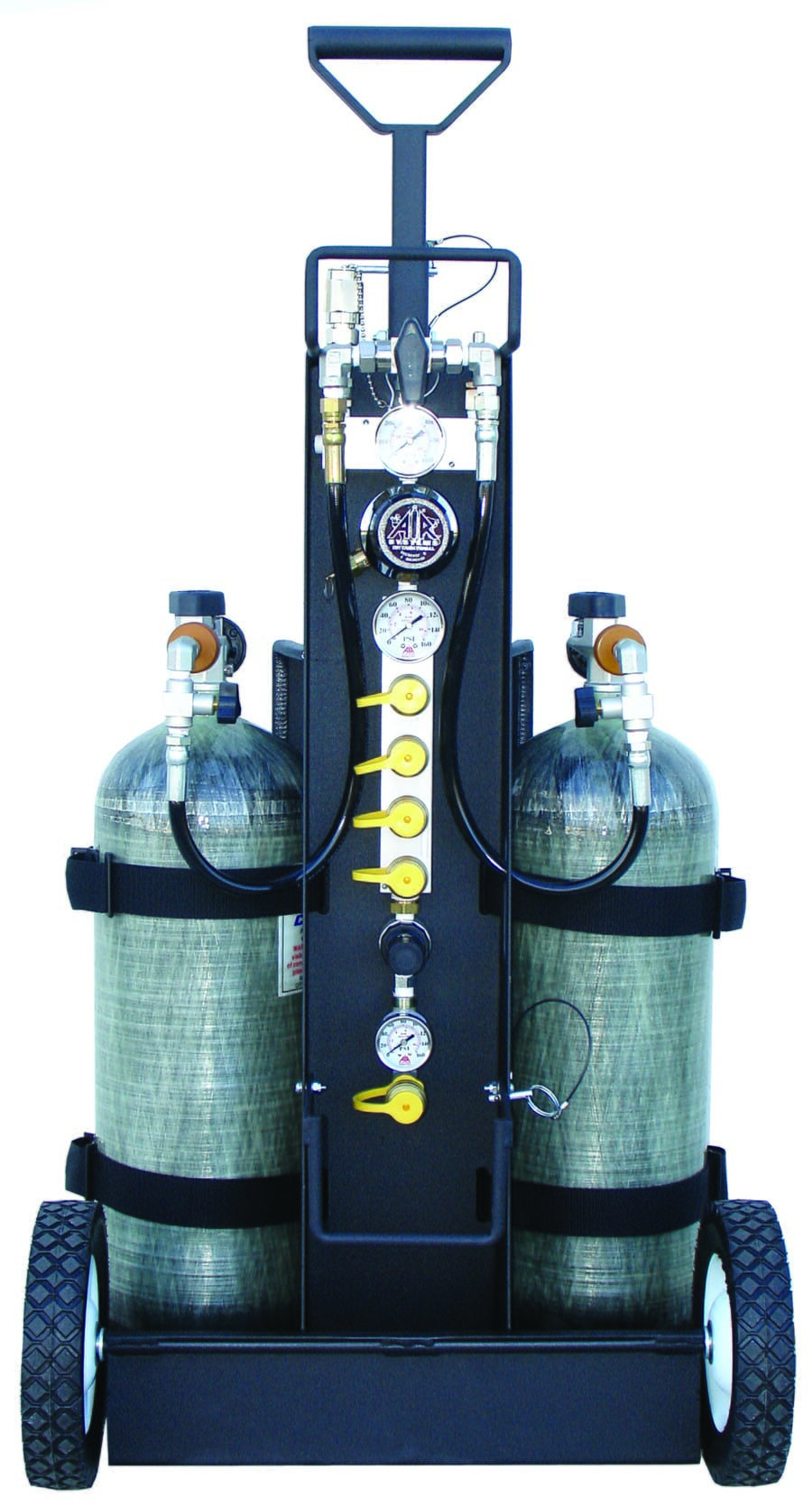 The MULTI-PAK series of small bottled air carts has been designed with the user in mind. Choose from many basic designs to fit the simplest or most complex job application. All of the small MULTI-PAK carts feature fold-down handles, recessed air control panels, rounded cart corners, quick release hose racks, and many other unique features. Choose the pressure range and number of fittings that you require. All carts have input and output pressure gauges. Cylinders sold separately. Ideal for working in hazardous locations.