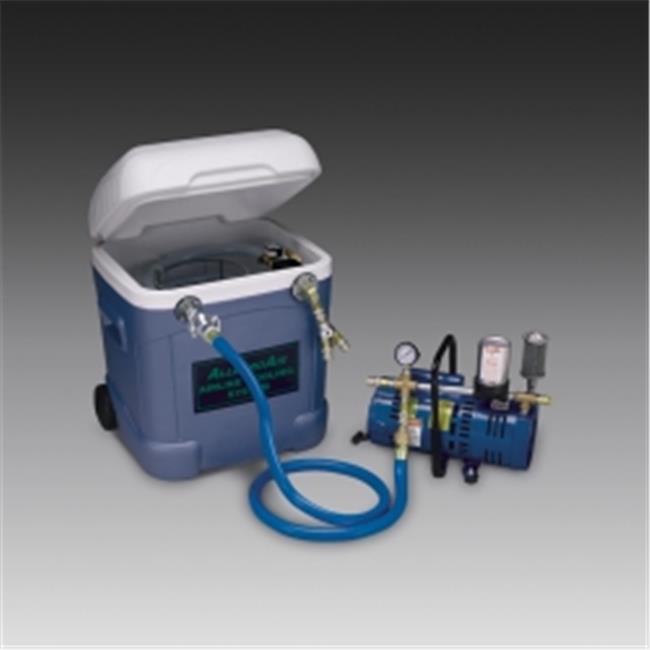 This is a perfect, low cost and portable means of cooling breathing air while keeping workers comfortable and productive for hours. The system is capable of reducing the air temperature from 180 deg F to as low as 50 deg F. The cooling system is connected to the Ambient Air Pump through a 5' long inlet supply airline using a heavy duty chicago style coupler. Air flowing through the FDA Grade PVC temperature cooling coil inside the 70 quart cooler reduces the air temperature by having ice poured onto and around the coil. Coils are separated to allow ice to surround hose. The outlet air is filtered at the end of the coil line by a 5 micron particulate air filter, which removes condensation that may build up in the hose.