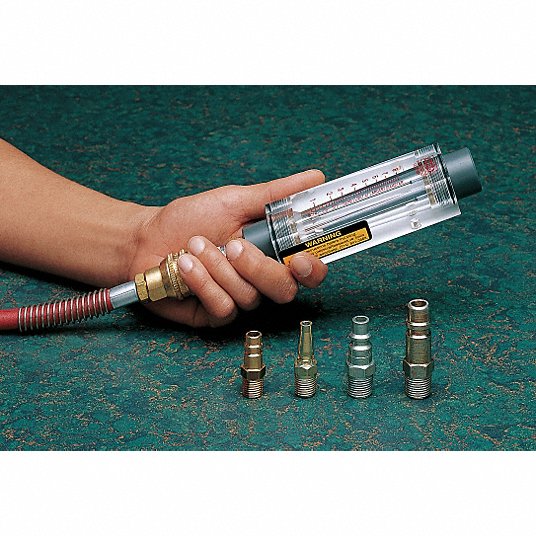 CFM tester checks the volume of air that gets to the respirator. A flow meter simply quick connects onto an airline hose to check the respirator system for NIOSH compliant air flows. The kit contains flow meter and a full assortment of quick connect plugs and adapters to fit all respirator manufacturer's airline hoses. Excellent for use with ambient air pumps. NOTE: NIOSH mandates 4 CFM for tight-fitting masks and 6 CFM for hoods.