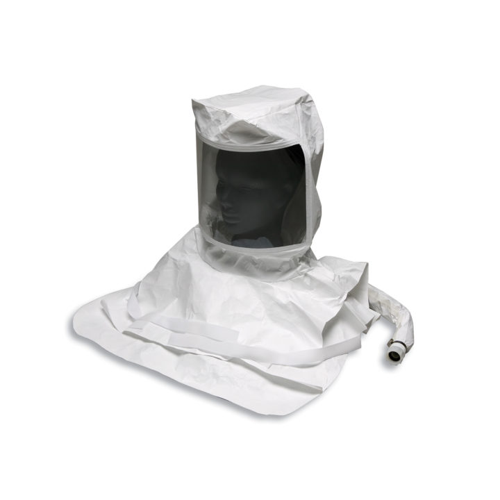Our Tyvek hood has a patented breathing tube integrated directly into the hood. The tube is splash-resistant and entirely disposable. Although made flexible for on-the-job performance, the multi-layer foam tubing material prevents downtubes from being crushed or twisted, with the tubes foam layers providing a sound-dampening system both unique and made in accordance with stringent NIOSH requirements. This hood is engineered without head harness for freedom of movement and comfort. Hook and loop underarm straps keep the hood from rising. 8 in x 14 in viewing window offers an extensive field of vision and aptly accommodates workers with beards or goggles. The hood can be used with either an Allegro Flow Control Valve, Allegro Personal Air Cooler, or an Allegro Air Temperature Controller. Constructed from poly-coated Tyvek, this double-bib hood offers greater protection for workers. Inner bib tucks into garments, allowing air to flow down across the body for a cooling effect.