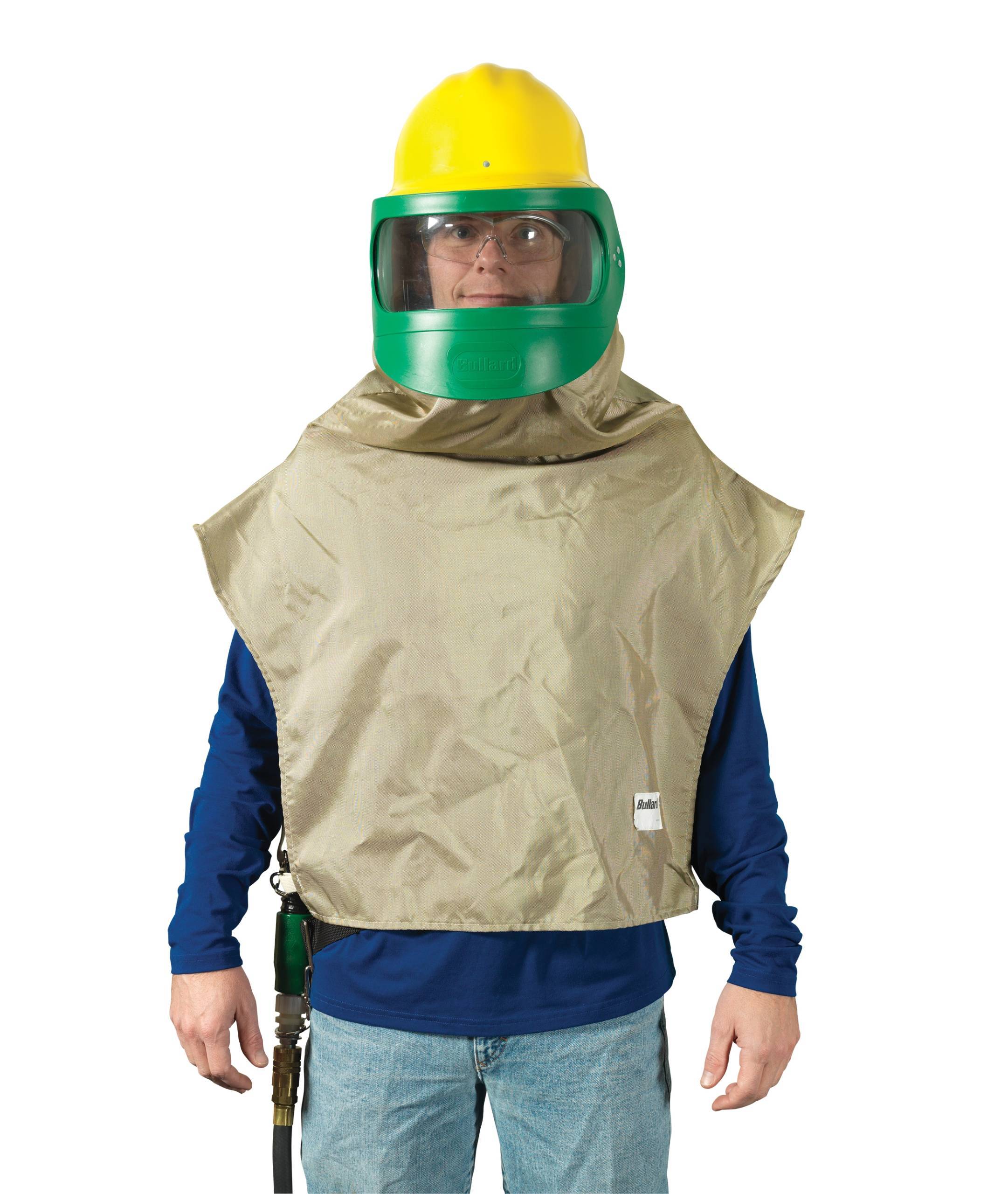 • Helmet and cape help protect the worker's entire head, face and upper body from abrasive rebound, airborne contaminants and messy overspray