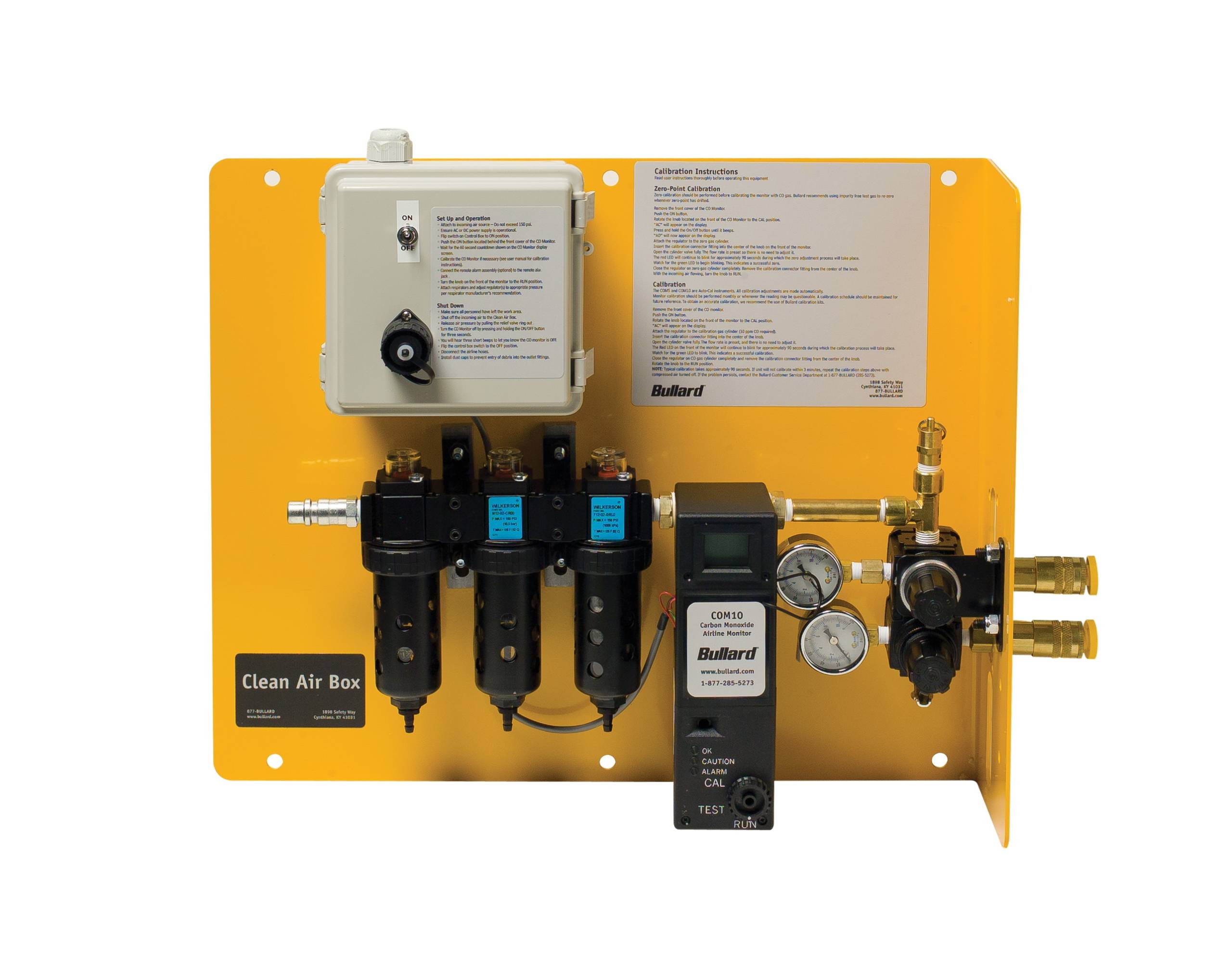 Bullard Clean Air Boxes (CAB) offer 3-stage filtration with carbon monoxide (CO) monitoring to comply with OSHA's requirement for providing workers with Grade D breathing air. Three stages of filtration remove oil, water, particulate, oil vapor and odors. Designed for single or multiple users with or without independent regulators in a portable or fixed option.