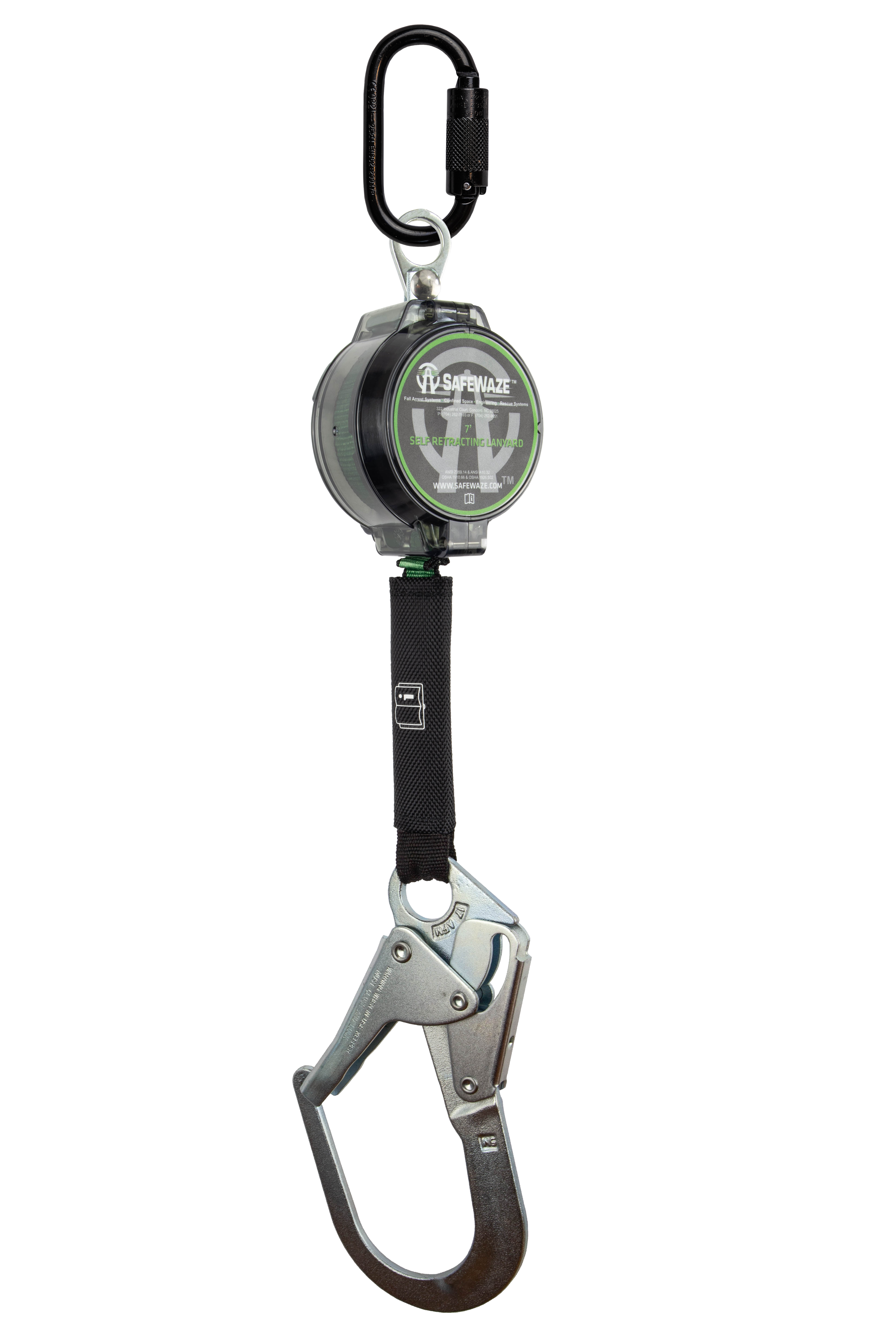 The SAFEWAZE 018-5010 single leg unit with a steel rebar hook is lightweight and has a durable translucent housing that not only looks unique, but protects the internal components from debris and contamination. The housing also makes for easy viewing and inspection of the webbing, reserve line, and pawl assembly. This unit comes with a steel triple lock carabiner.