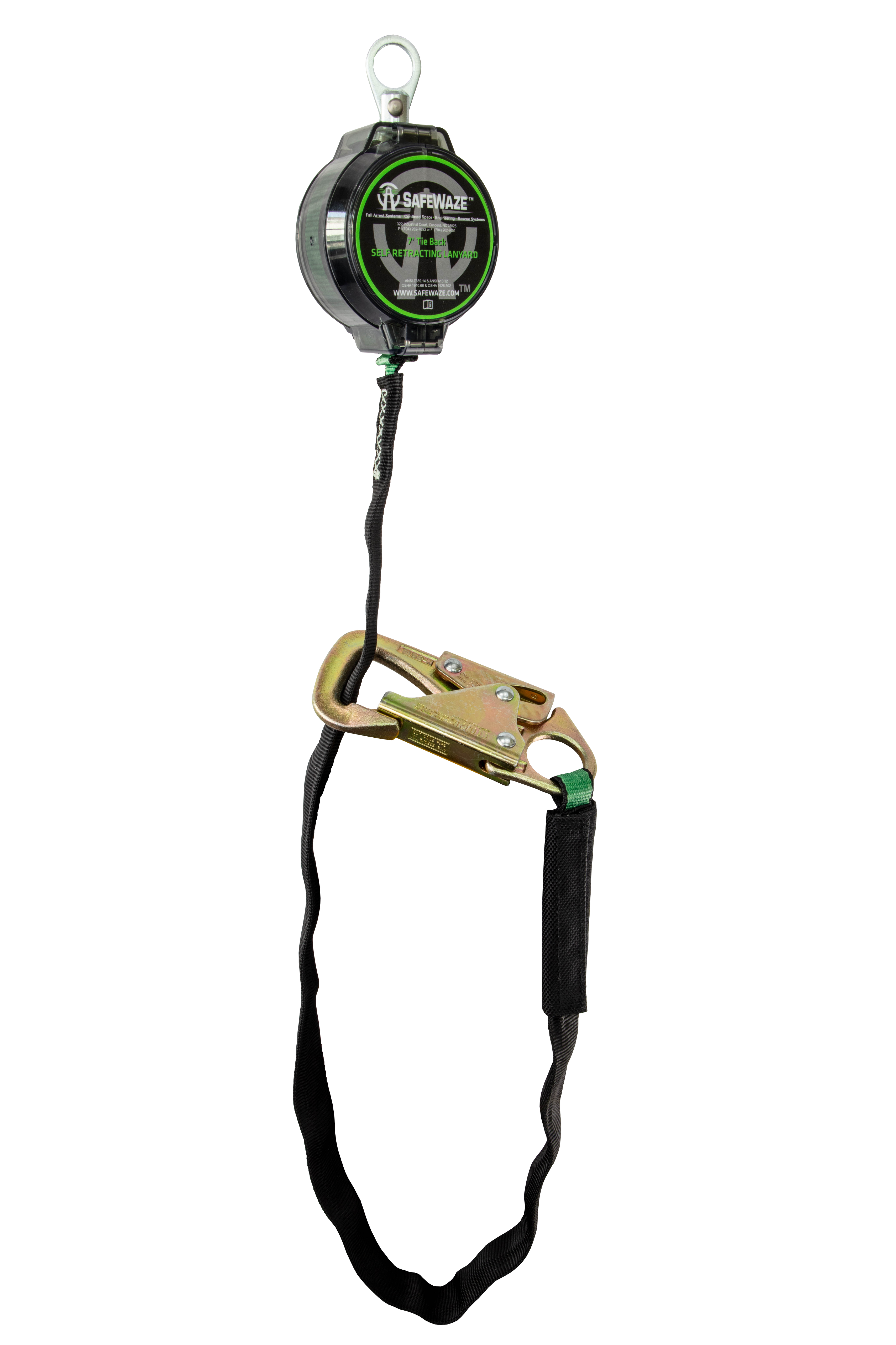 The SAFEWAZE 018-5028 tie back SRL comes with our 3/4 in steel tie back snap hook. It has all the same lightweight and durable features offered in our standard 7 ft series with a new wear pad protected tie back leg allowing for anchorage connection from 9-1/2 in to 36 in.