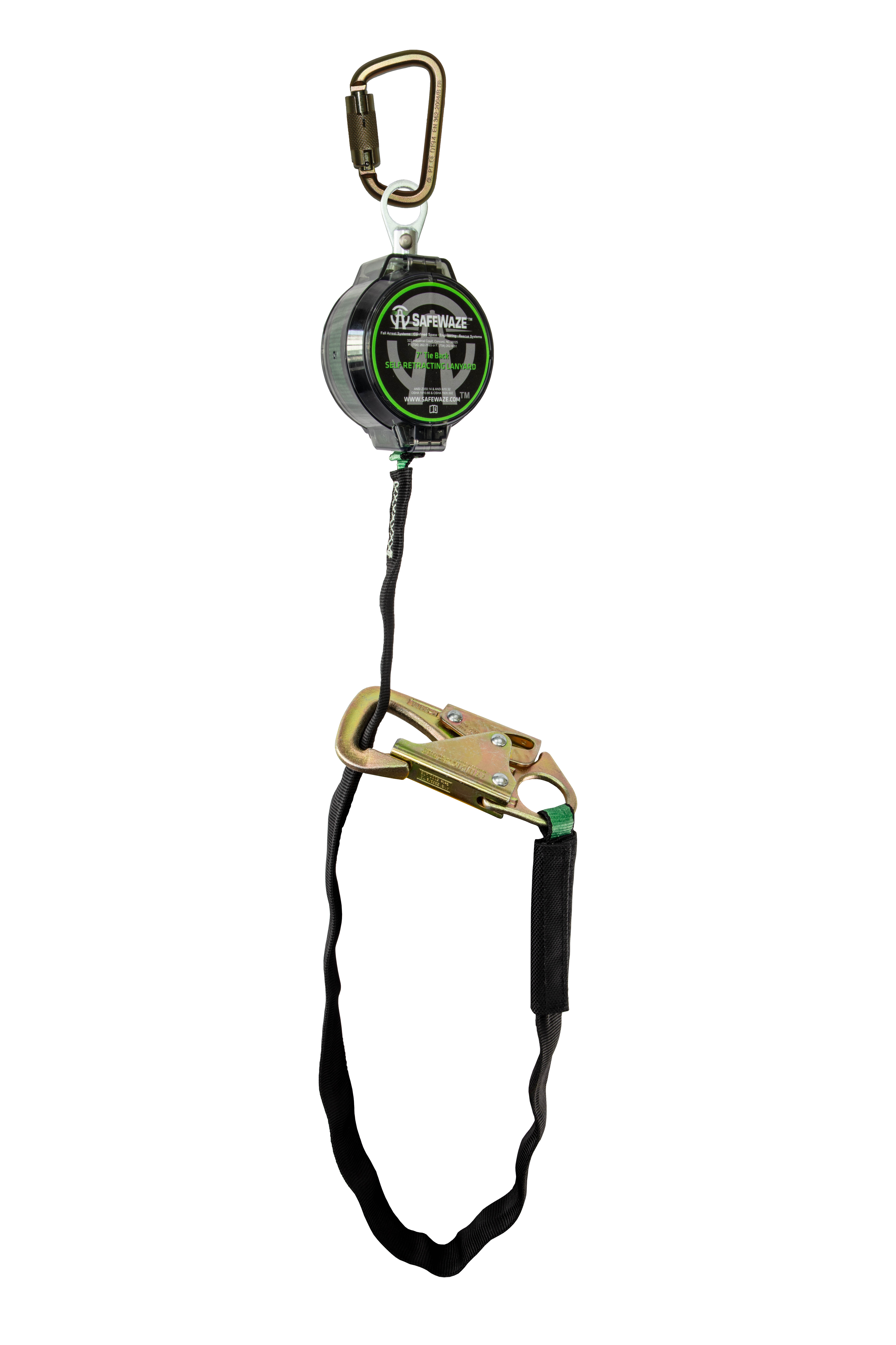 The SAFEWAZE 018-5029 tie back SRL comes with our steel carabiner, and 3/4 in steel tie back snaphook. It has all the same lightweight and durable features offered in our standard 7 ft series with a new wear pad protected tie back leg allowing for anchorage connection from 9-1/2 in to 36 in.