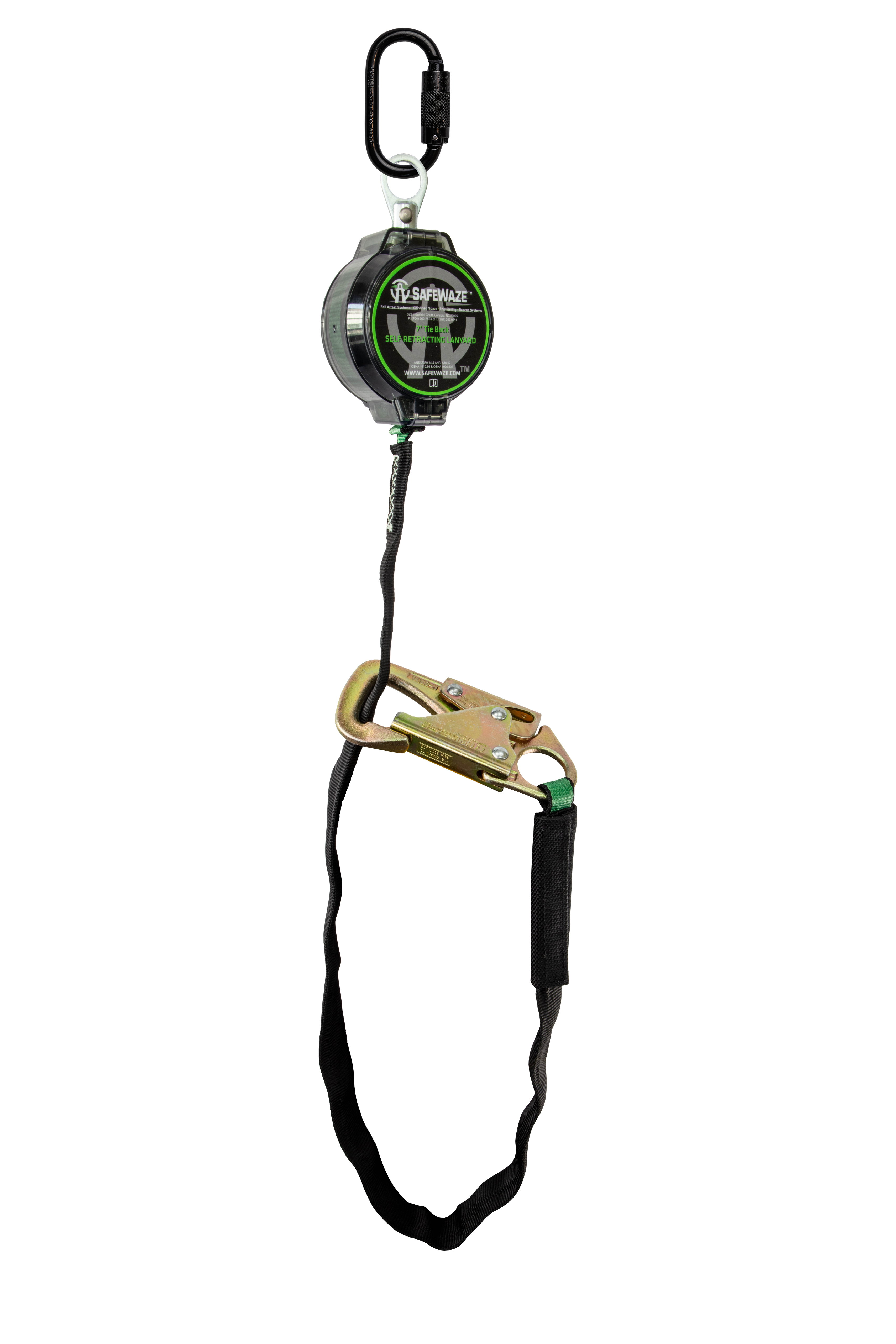 The SAFEWAZE 018-5030 tie back SRL comes with our triple lock steel carabiner, and 3/4 in steel tie back snaphook. It has all the same lightweight and durable features offered in our standard 7 ft series with a new wear pad protected tie back leg allowing for anchorage connection from 9-1/2 in to 36 in.