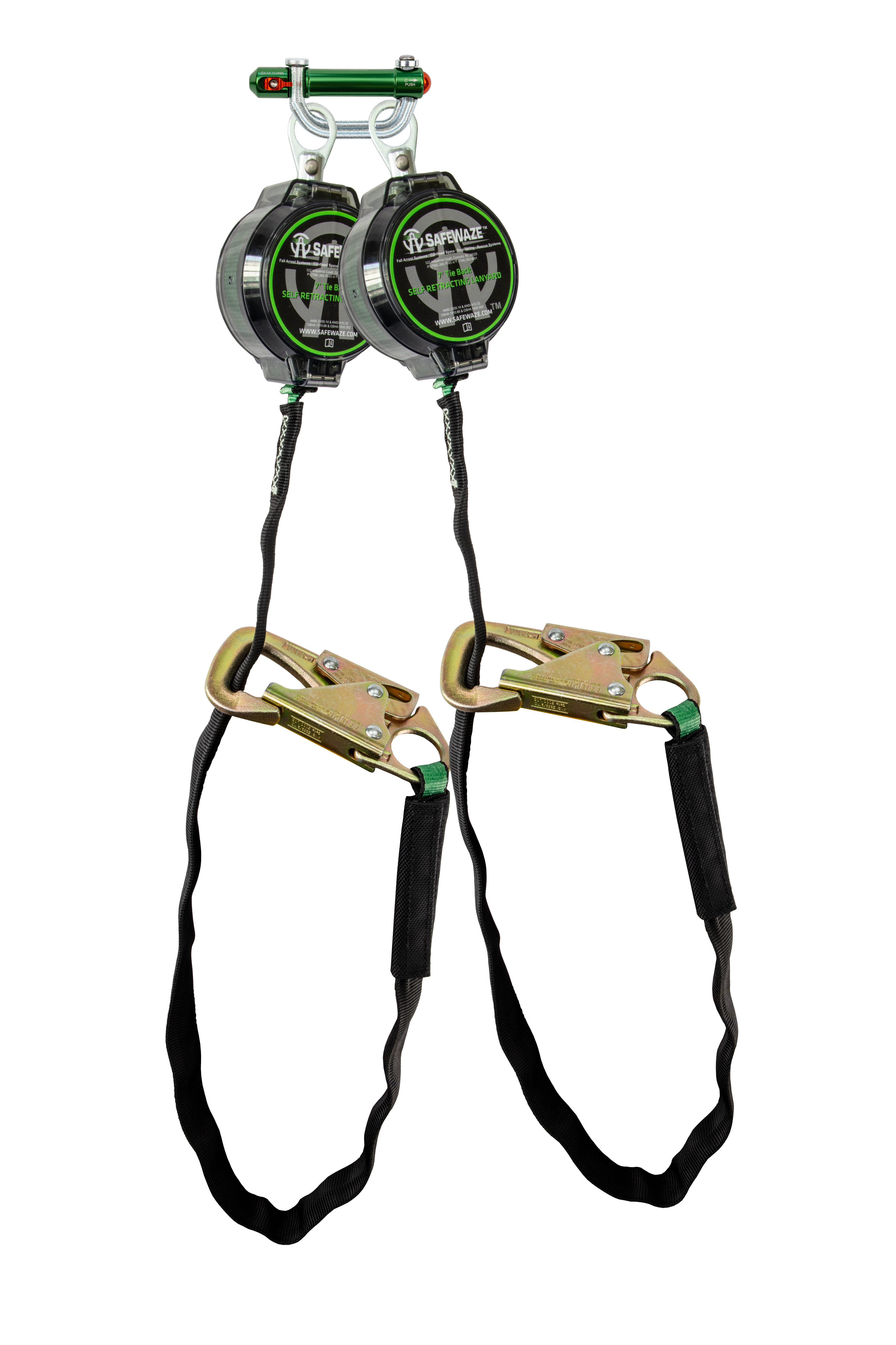 The SAFEWAZE 018-5036 tie back SRL comes with our 9013 behind the web bracket, and 3/4 in Steel Tie Back Snaphook. It has all the same lightweight and durable features offered in our standard 7 ft series with new wear pad protected tie back legs allowing for anchorage connection from 9-1/2 in to 36 in.
