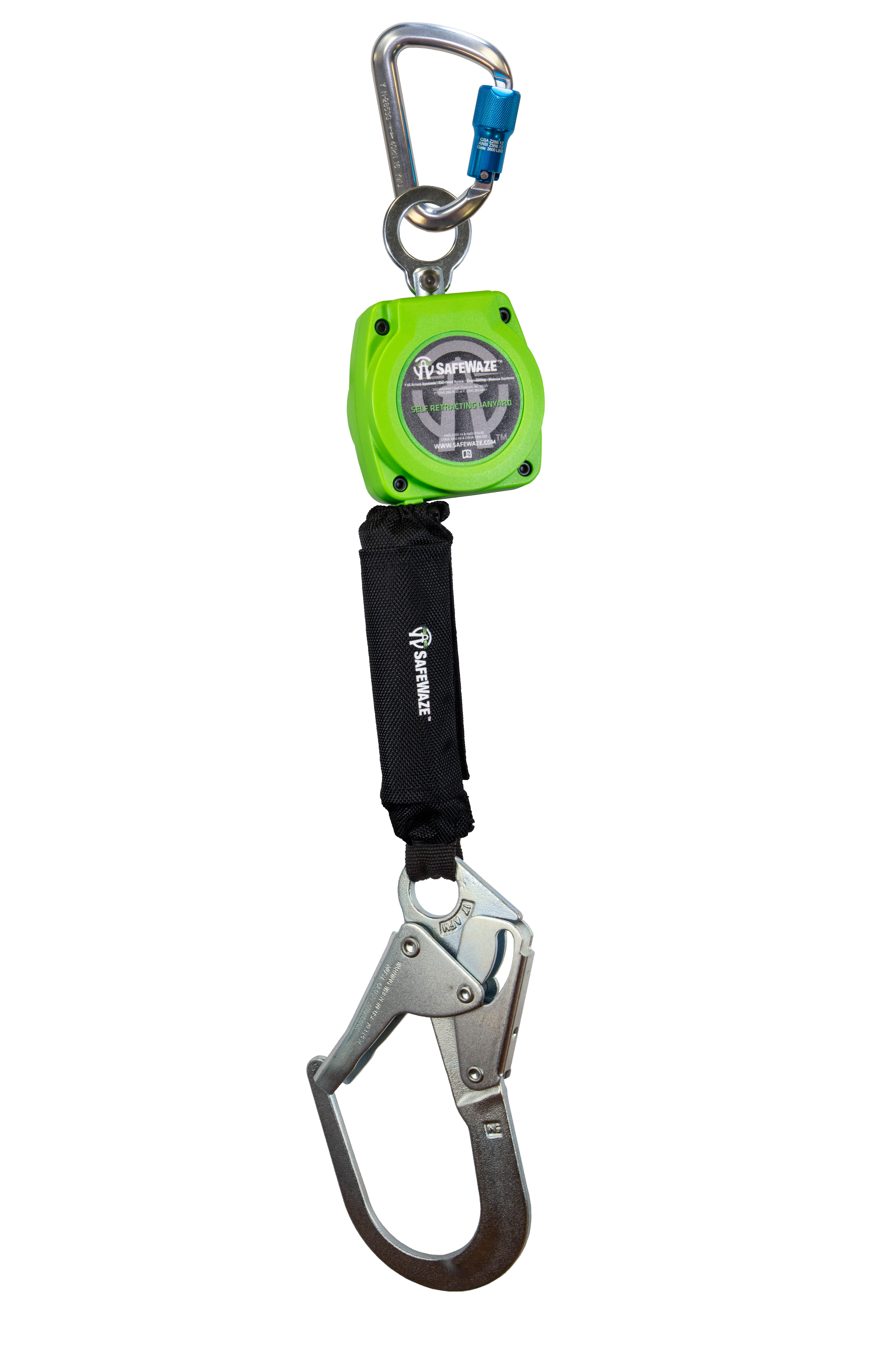 The SAFEWAZE 019-5050 Class A 6 ft web self-retracting lifeline with a steel rebar hook combines lightweight design with durability. The unit comes with an aluminum carabiner and has a rotating and pivoting attachment point for improved mobility, making it the ideal personal retractable.