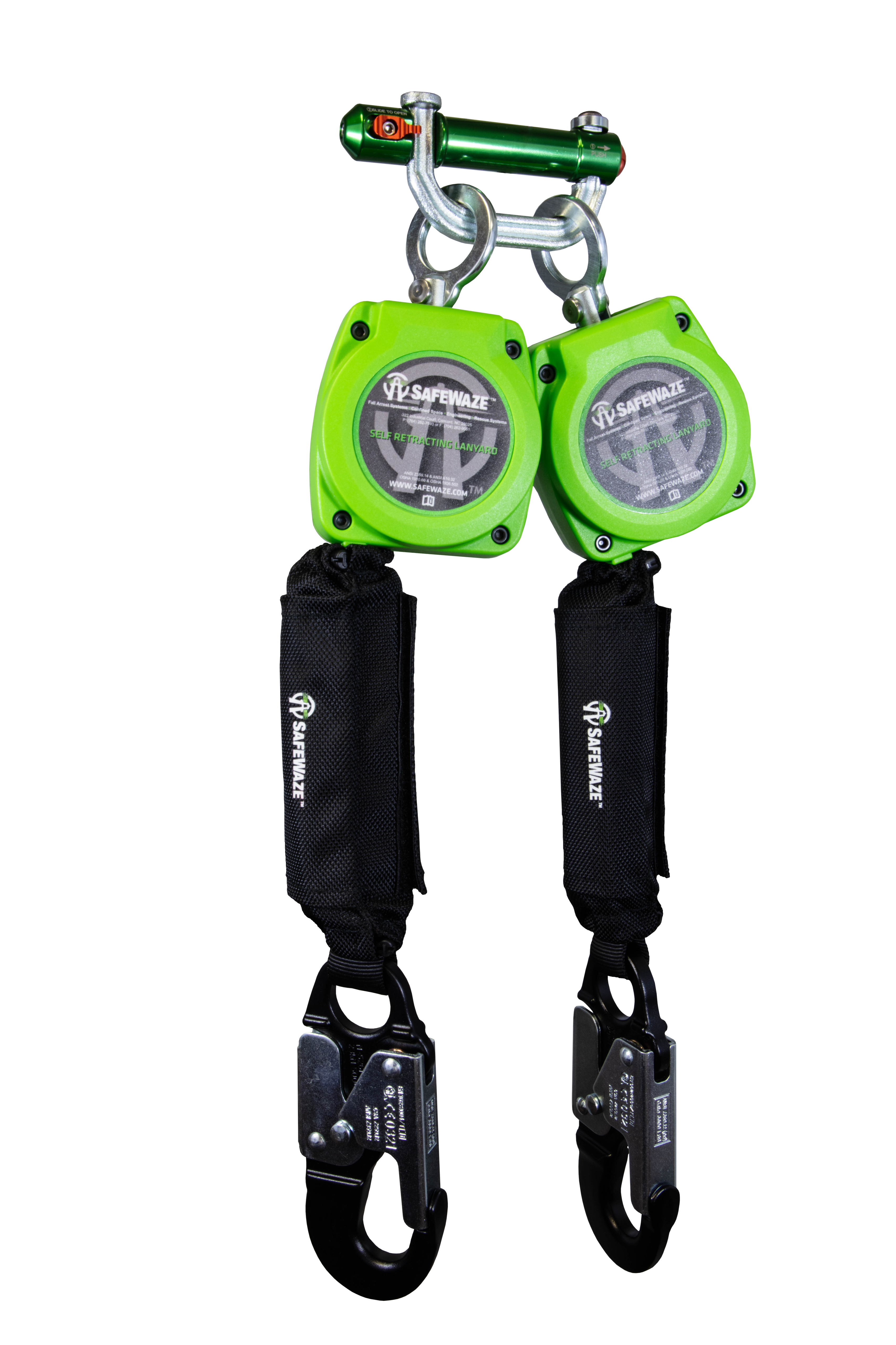 The SAFEWAZE 019-5053 Class A 6 ft dual-leg web self-retracting lifeline with aluminum snap hooks combines lightweight design with durability. These units come with our 9013 Behind-the-Web Bracket and have rotating and pivoting attachment points for improved mobility, making it the ideal personal dual-leg unit.
