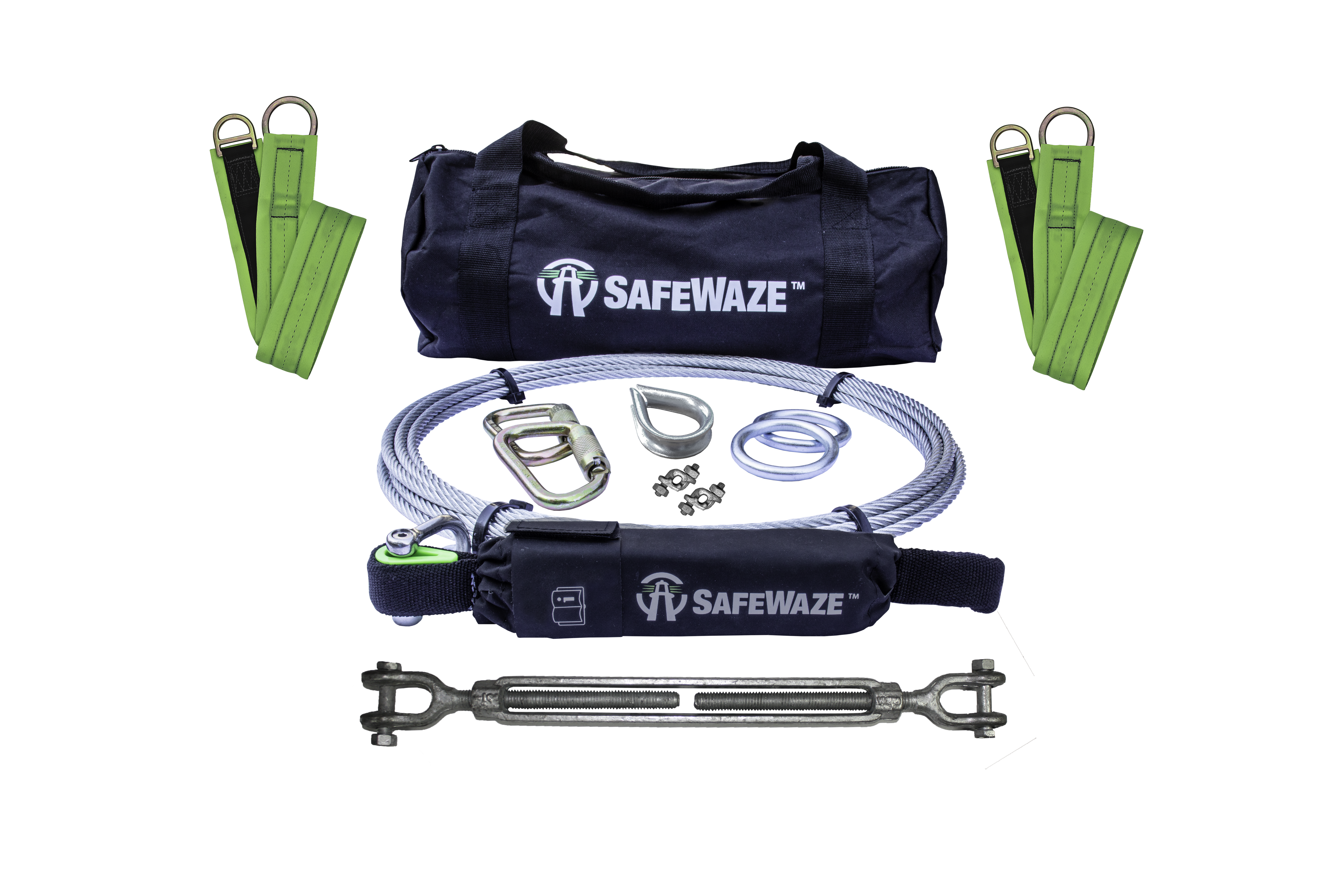 The 2 person cable horizontal lifeline kit comes with of cable, heavy duty cross arm straps, turnbuckle, shock pack with protective cover, O-rings, carabiners, fist grips and a cable thimble. All of the kit components fit conveniently in the carrying and storage bag. Additional cable lengths options are also available.