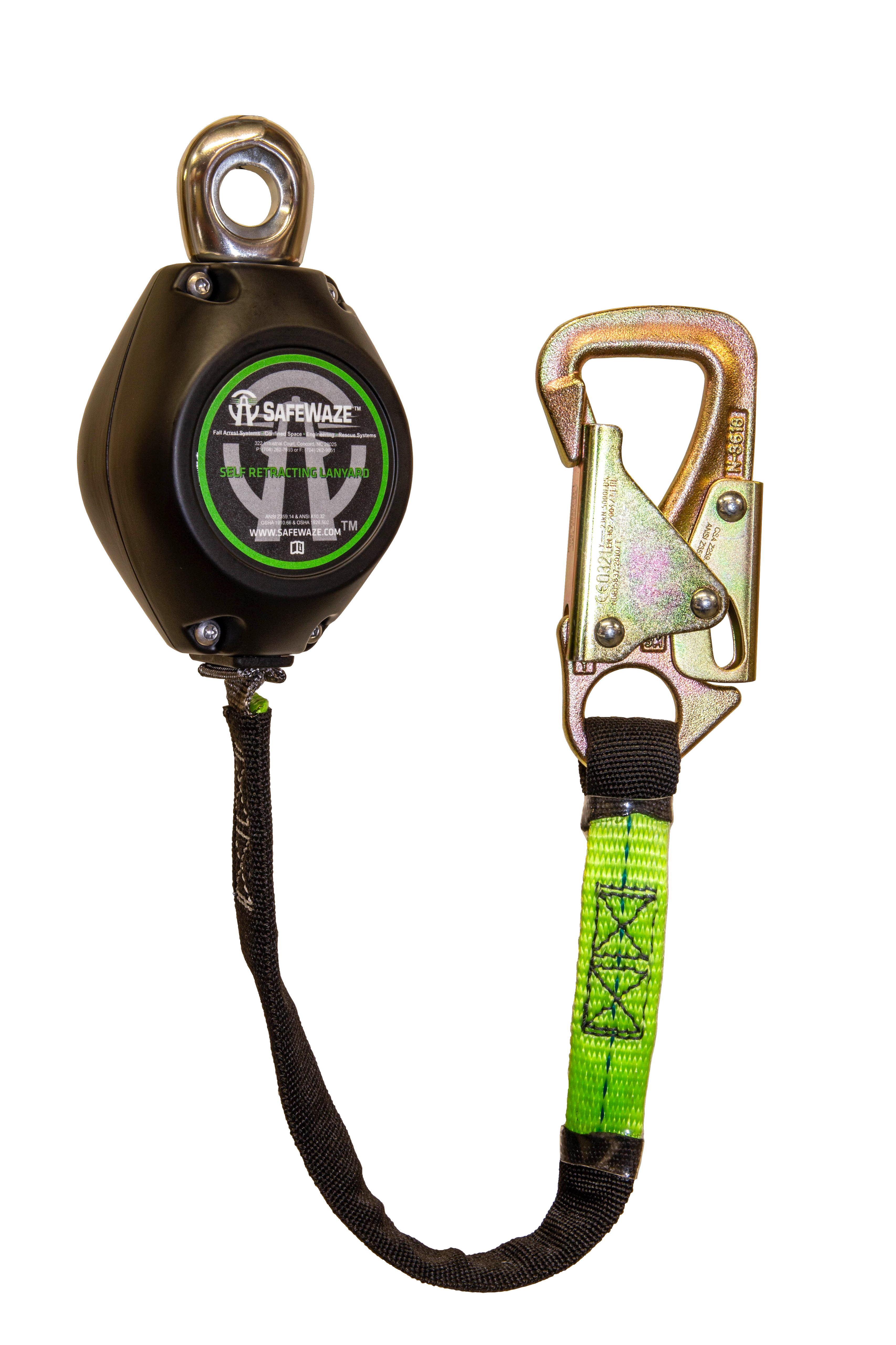 The SAFEWAZE FS-FSP1407-W-TBH 7 ft web retractable lifeline features a mobility enhancing swivel-top, rugged durable housing, and unique braking system that eases shock and minimizes free fall distance in the event of a fall. The unit also includes a fall indicator that is sewn into the webbing.