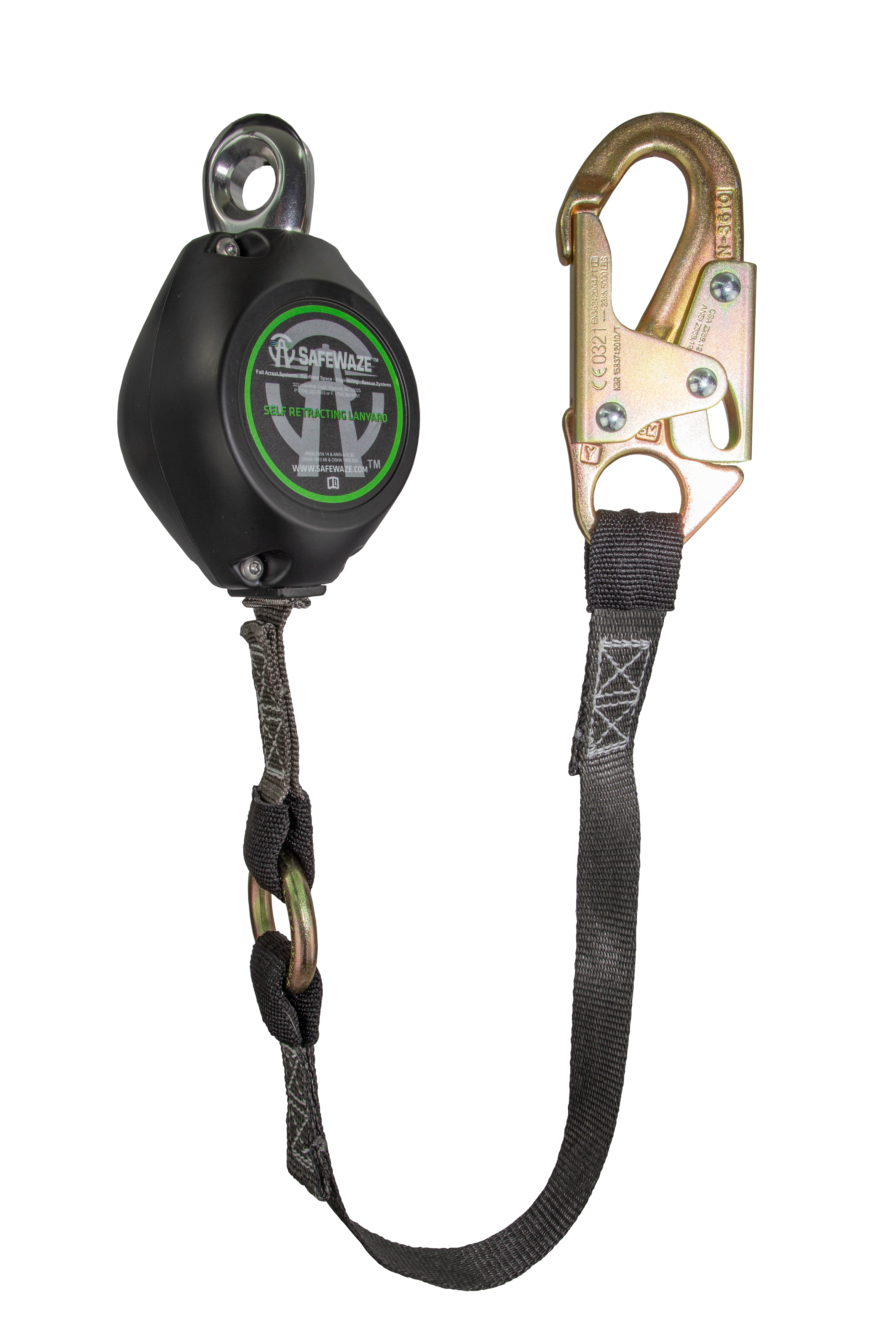 The SAFEWAZE FS-FSP1409-W 9 ft web retractable lifeline features a mobility enhancing swivel-top, rugged durable housing, and unique braking system that eases shock and minimizes free fall distance in the event of a fall. The unit also includes a fall indicator that is sewn into the webbing.