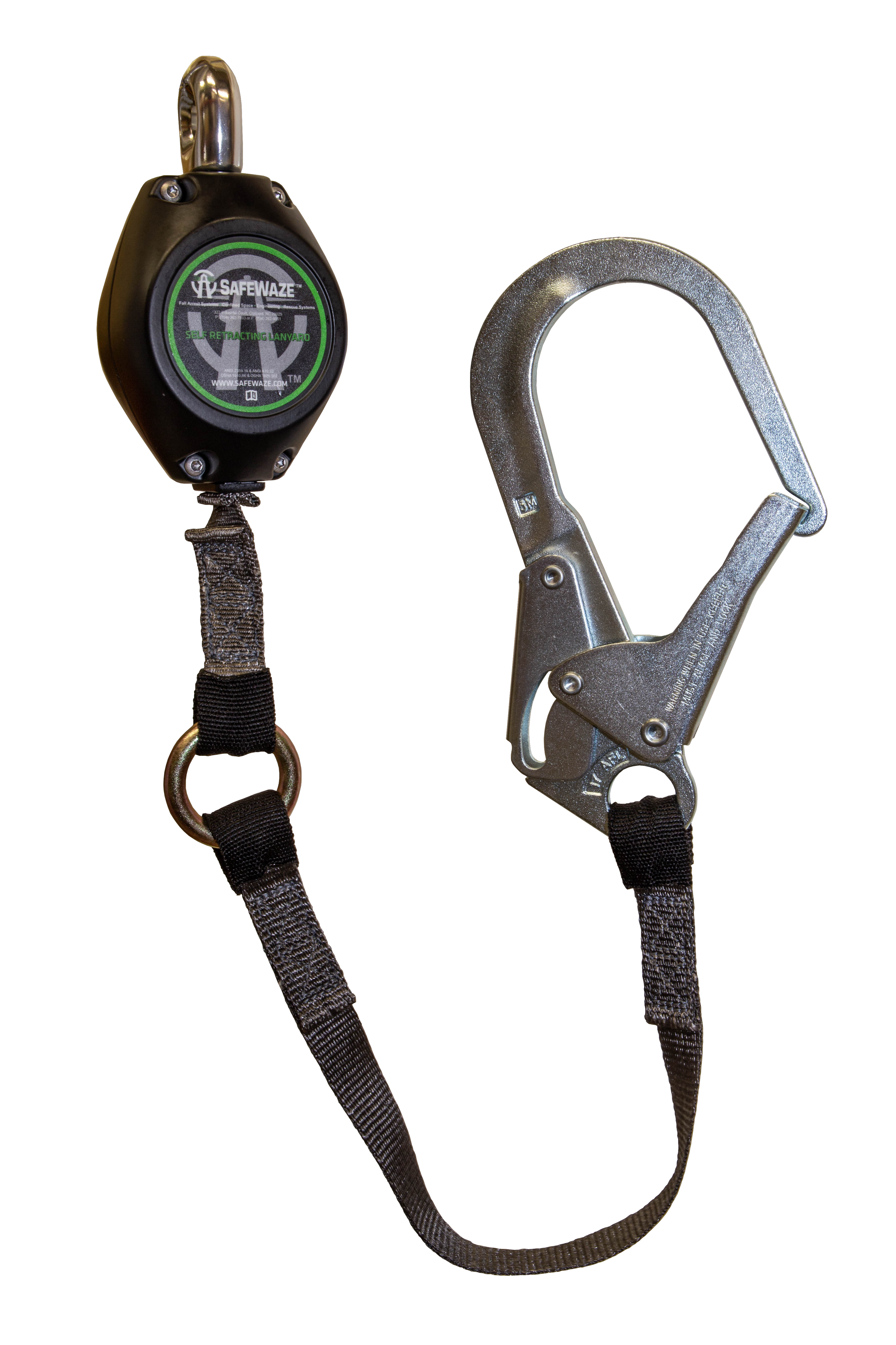 The SAFEWAZE FS-FSP1409-W-RBH 9 ft web retractable lifeline features a mobility enhancing swivel-top, rugged durable housing, and unique braking system that eases shock and minimizes free fall distance in the event of a fall. The unit also includes a fall indicator that is sewn into the webbing.