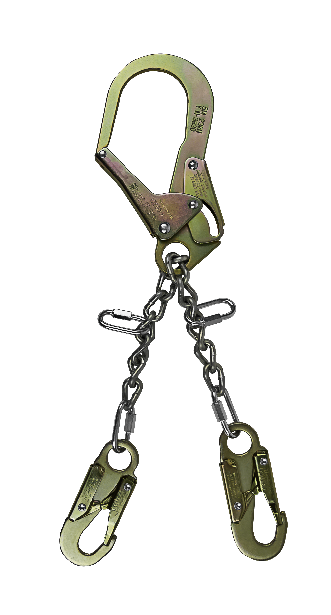 The SAFEWAZE FS060-E rebar chain assembly is designed to be used as a single-person positioning device on rebar forms, and features 2 double-locking snap hooks and a large rebar hook (designed to fit a Symons Form). Comes with two adjustable quick links.