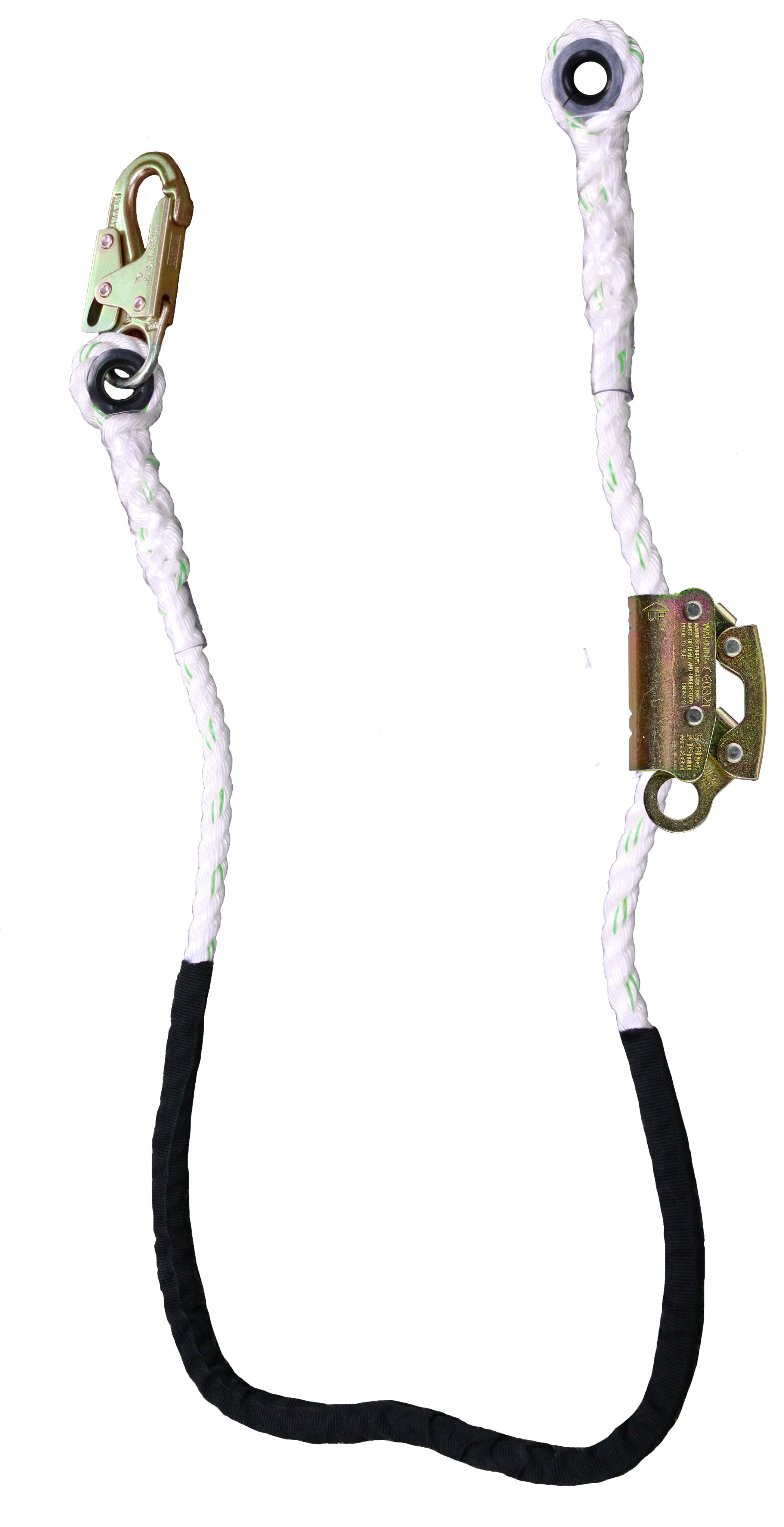 The SAFEWAZE FS33200 is a 6 ft PolyDac rope positioning lanyard with one 3600 lb gate rated snap hook at one end and a thimbled loop at other. The lanyard also includes a SAFEWAZE FS1117 rope grab for additional positioning options and a wear sleeve for increased durability.