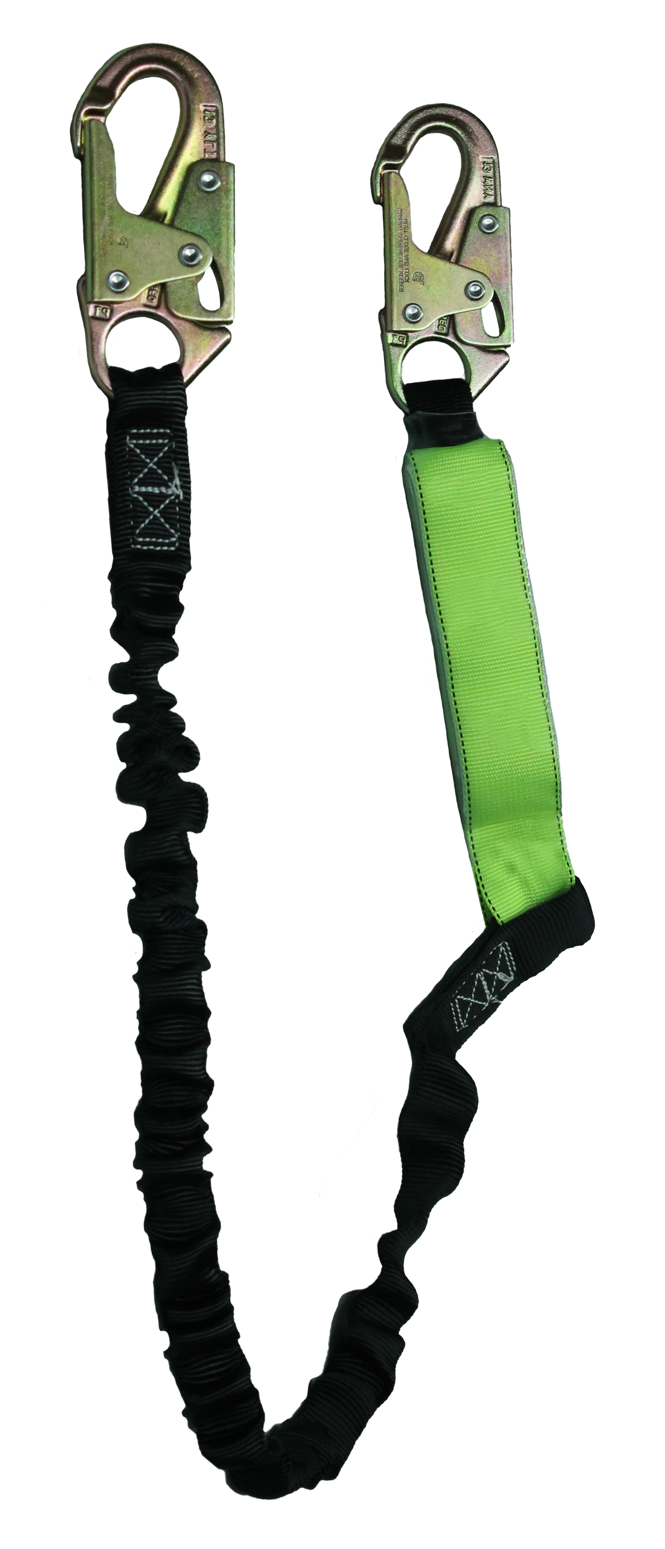 - 1-1/4 in stretch tubular webbing, 1 in core stretchable webbing, high-strength polyester stitching, shock absorber, stamped steel snap hooks: 3600 lb gate rated, minimum breaking strength > 5000 lb