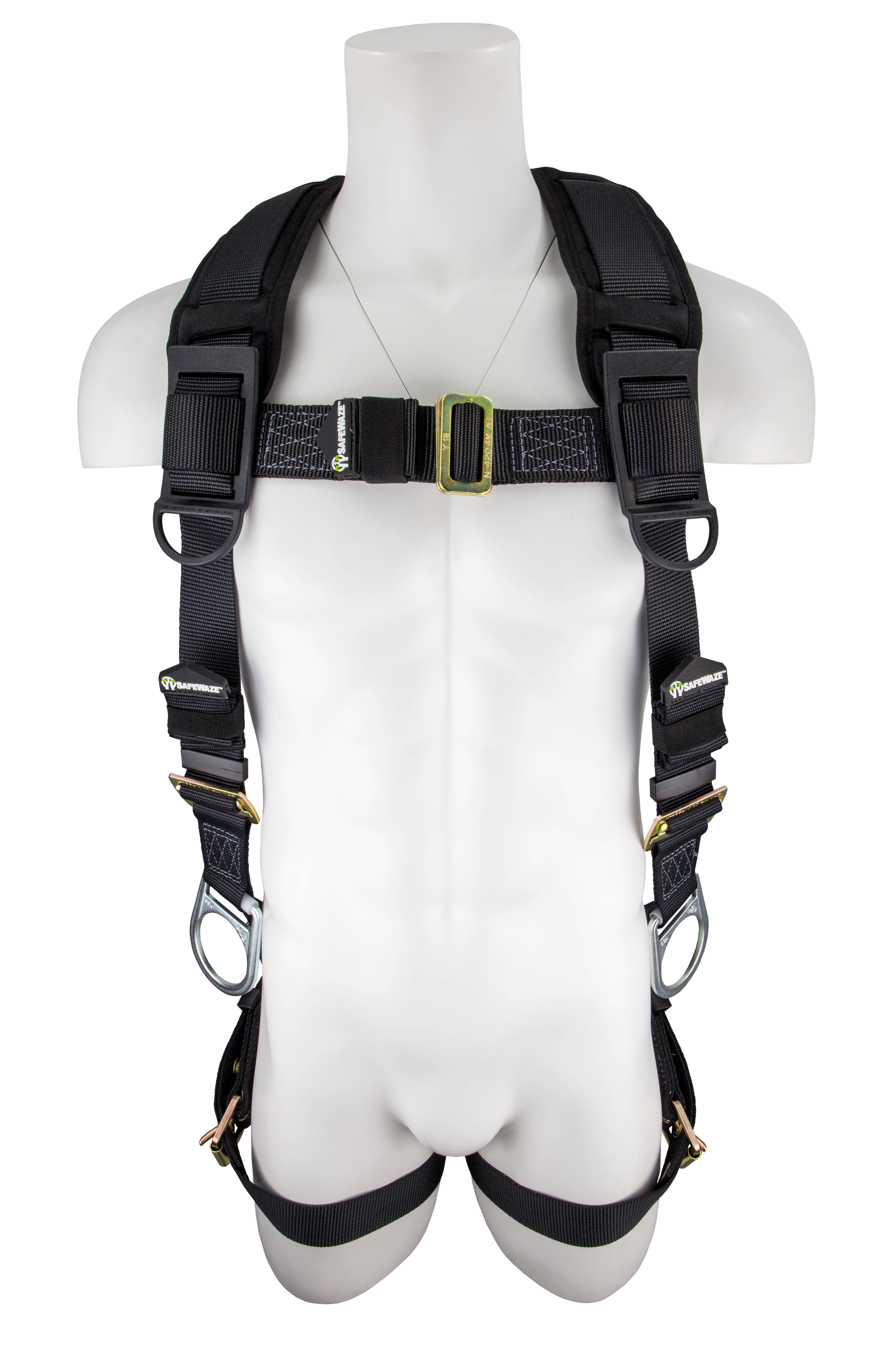 The SAFEWAZE PRO heavy weight vest-style fall protection harness is rated at 420 lbs and includes premium polyester webbing, lanyard keepers, and an adjustable chest strap. The harness also includes 3 D-rings.