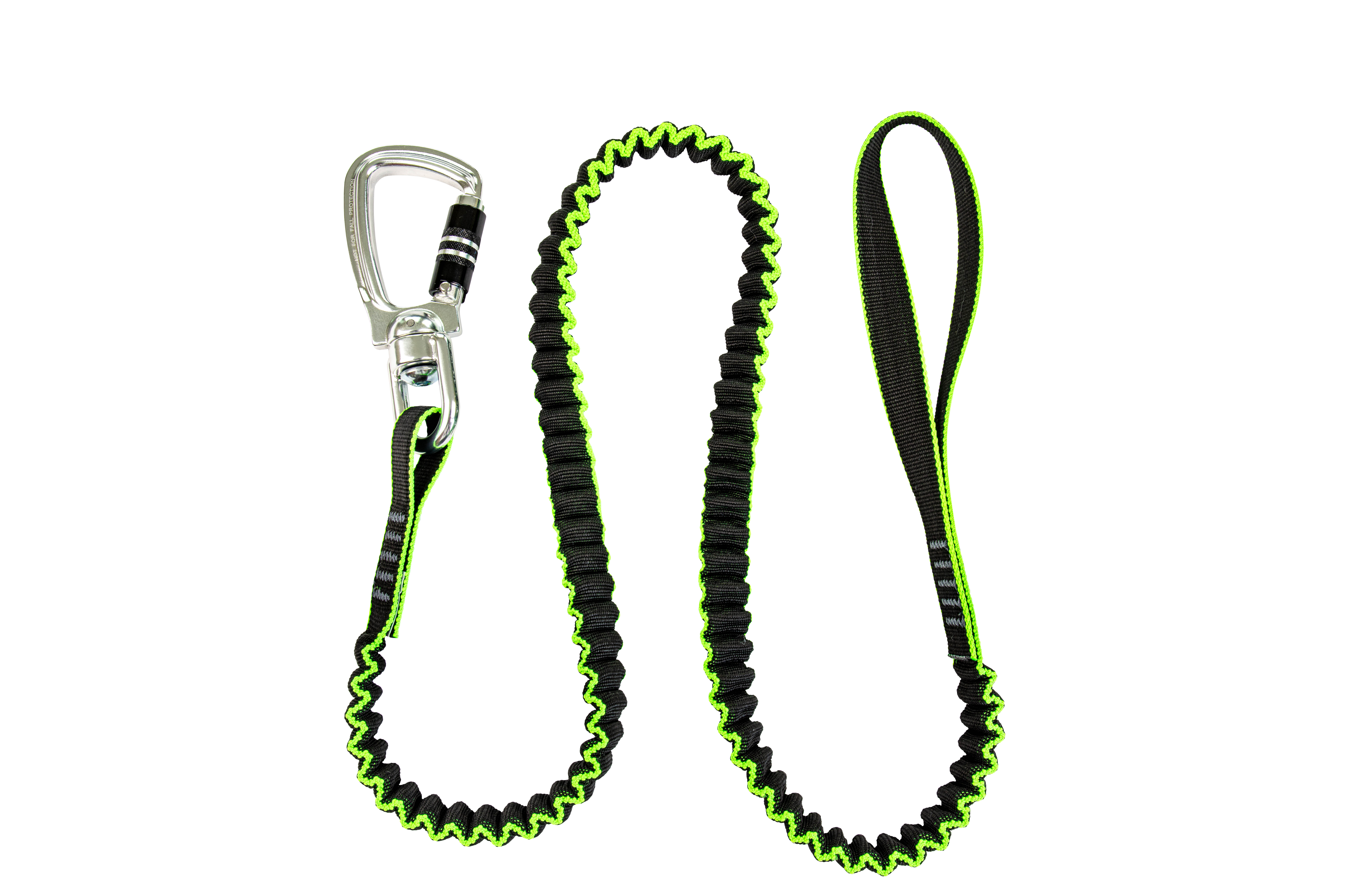 The SW431 35 lb medium duty tool tether features a swivel aluminum twist locking carabiner on one end and a choker web loop on the other. Its elasticated, energy absorbing webbing allows it to stretch from 50 in to 66 in.
