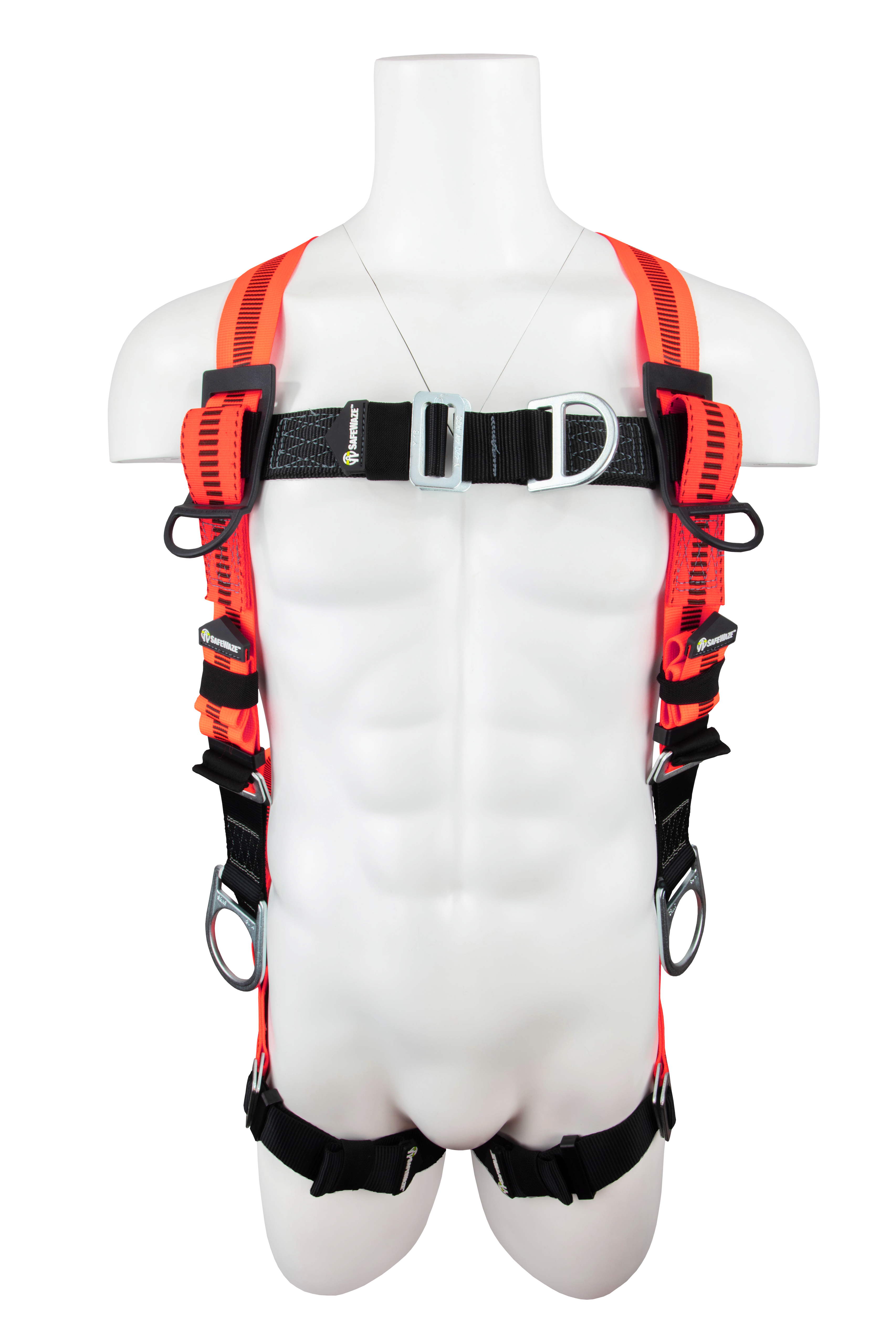 The SAFEWAZE V-Line 4 D-Ring fall protection harness is made from ergonomic materials and offers versatility with forged front and back D-rings, and 2 forged positioning side D-rings.