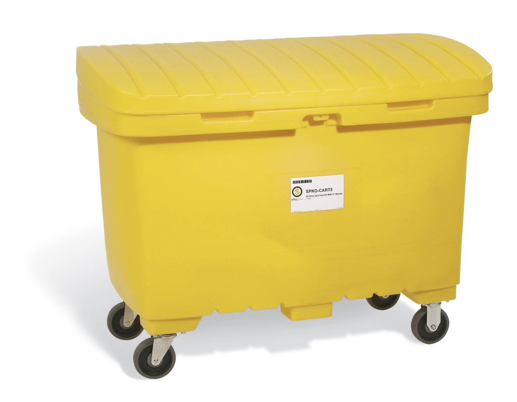 Easy-to-locate, bright yellow wheeled container rolls quickly to a spill site; fits easily through doorways and aisles. Can also be moved with a forklift