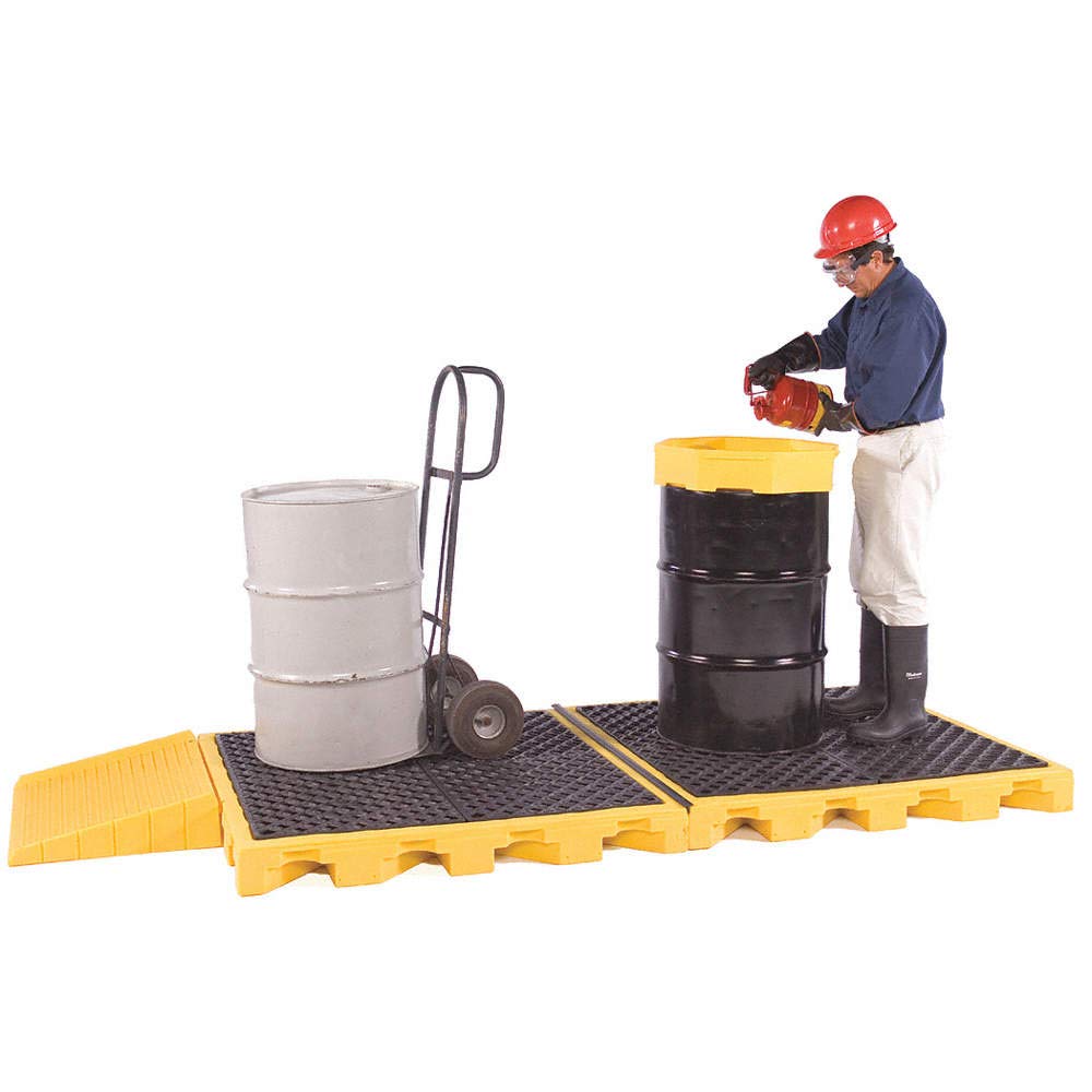 Ultratech 1074 spill deck P8 system can be used for hazardous waste collection, storage of virgin chemicals, drum dispensing and battery storage. Rust and corrosion free all polyethylene plastic construction provides excellent resistance to a broad range of chemicals including acids, solvents and oils. Able to hold eight 55 gal steel or poly drums. Spill capacity of 88 gallon. Load capacity of 12000 lb. The Ultratech 1074 spill deck P8 system is comprised of two 4-drum modules. Their modular design allows them to connect using a bulkhead fitting. Bulkhead fittings not only "lock" connected modules together, but allow spilled liquids to flow from one module to the next. Low profile deck height for safe and convenient loading/unloading of drums. Meets EPA 40 CFR 264.175 and Uniform Fire Code Spill Containment Regulations.
