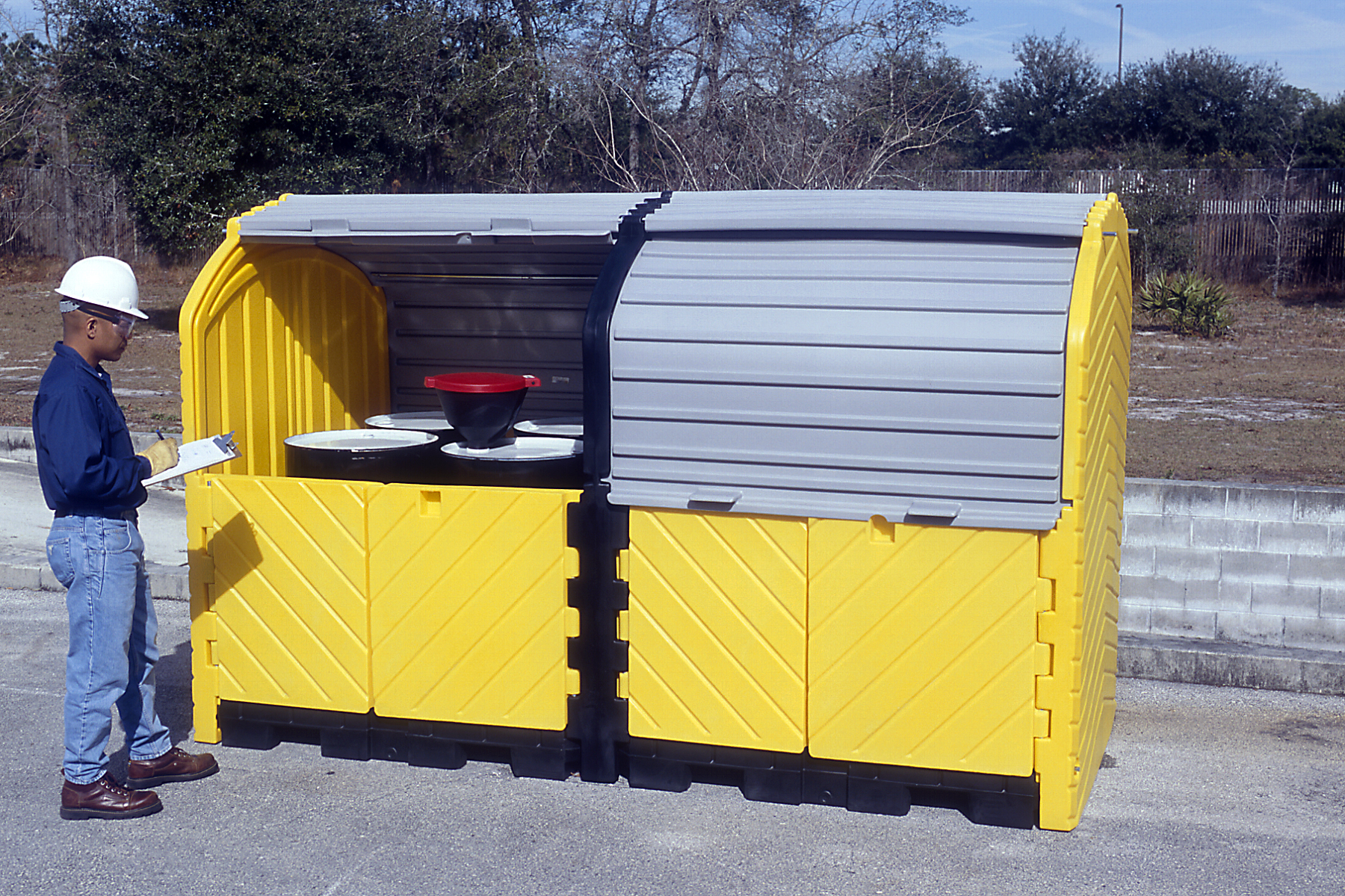 - Multiple "4-drum compartments" offer flexible usage for a broad range of operations including storage of virgin chemicals, active hazardous waste collection, and storage of spill response supplies