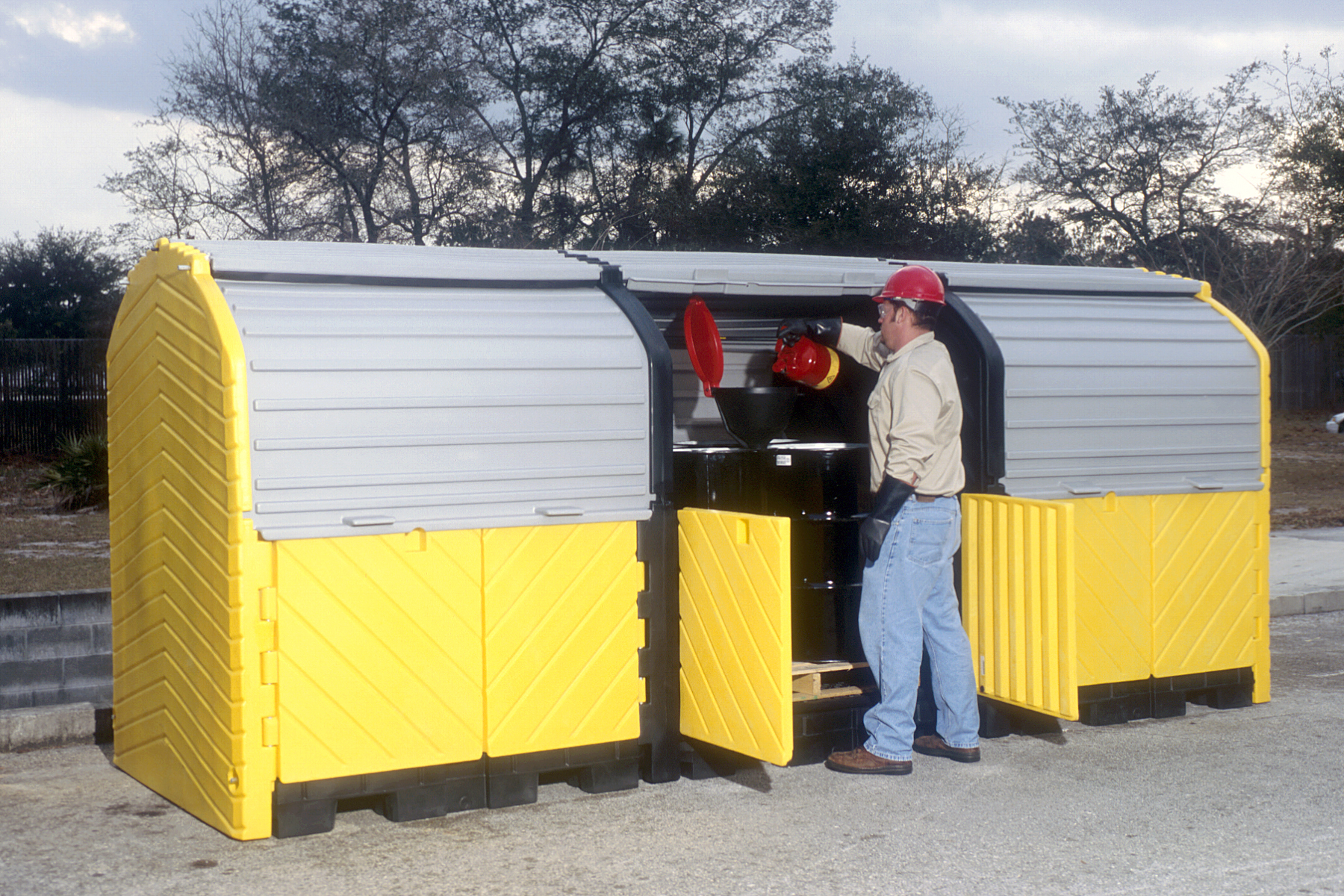 • Multiple "4-drum compartments" offer flexible usage for a broad range of operations including storage of virgin chemicals, active hazardous waste collection, and storage of spill response supplies